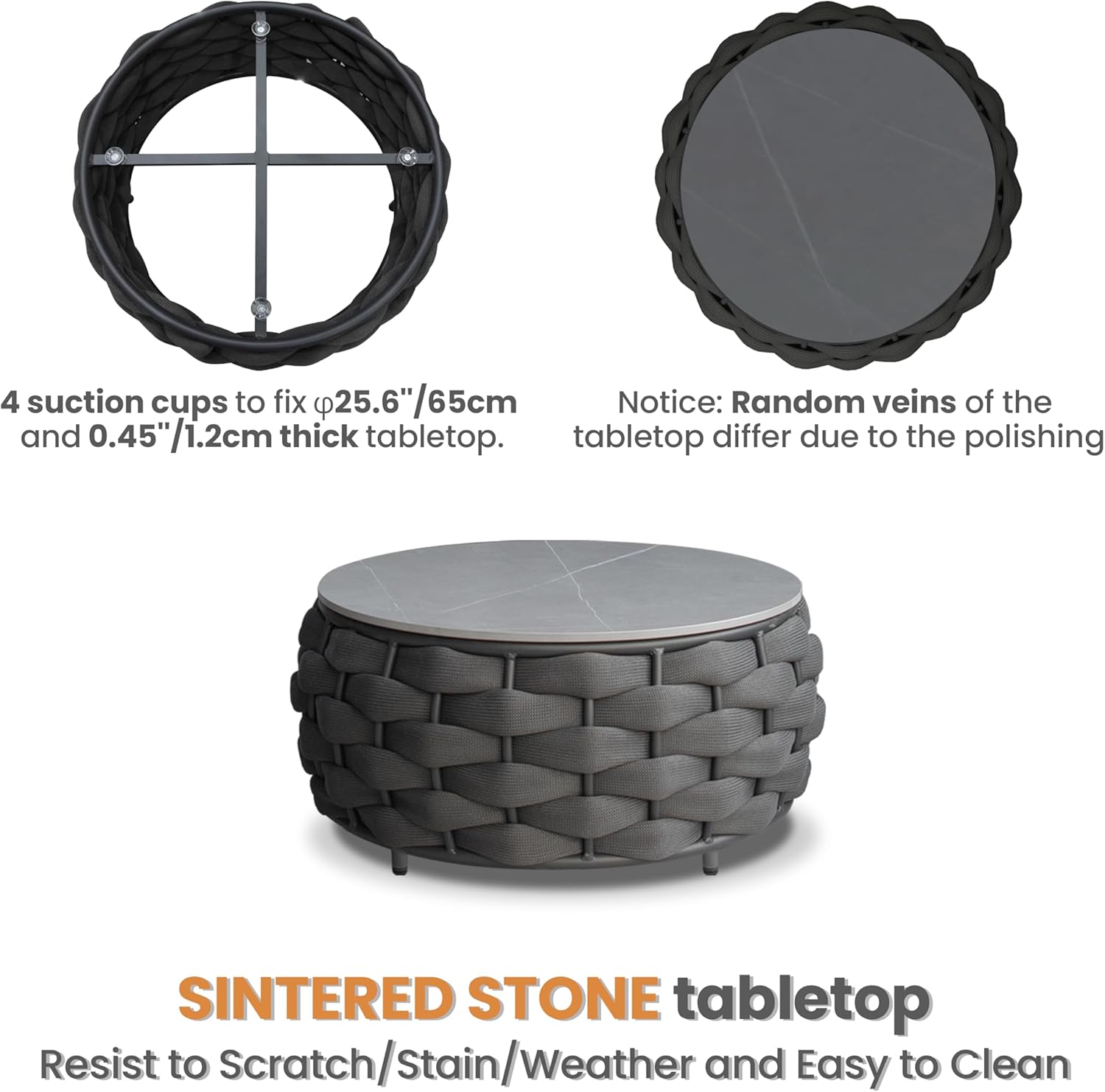 - Easy cleaning and scratch-resistant sintered stone tabletop is fixed by 4 suction cups. Cushions covers replaceable removal and machine washable. Accent chair relaxation set equipped with adjustable nylon feet levelers for uneven floor also prevent scratching
