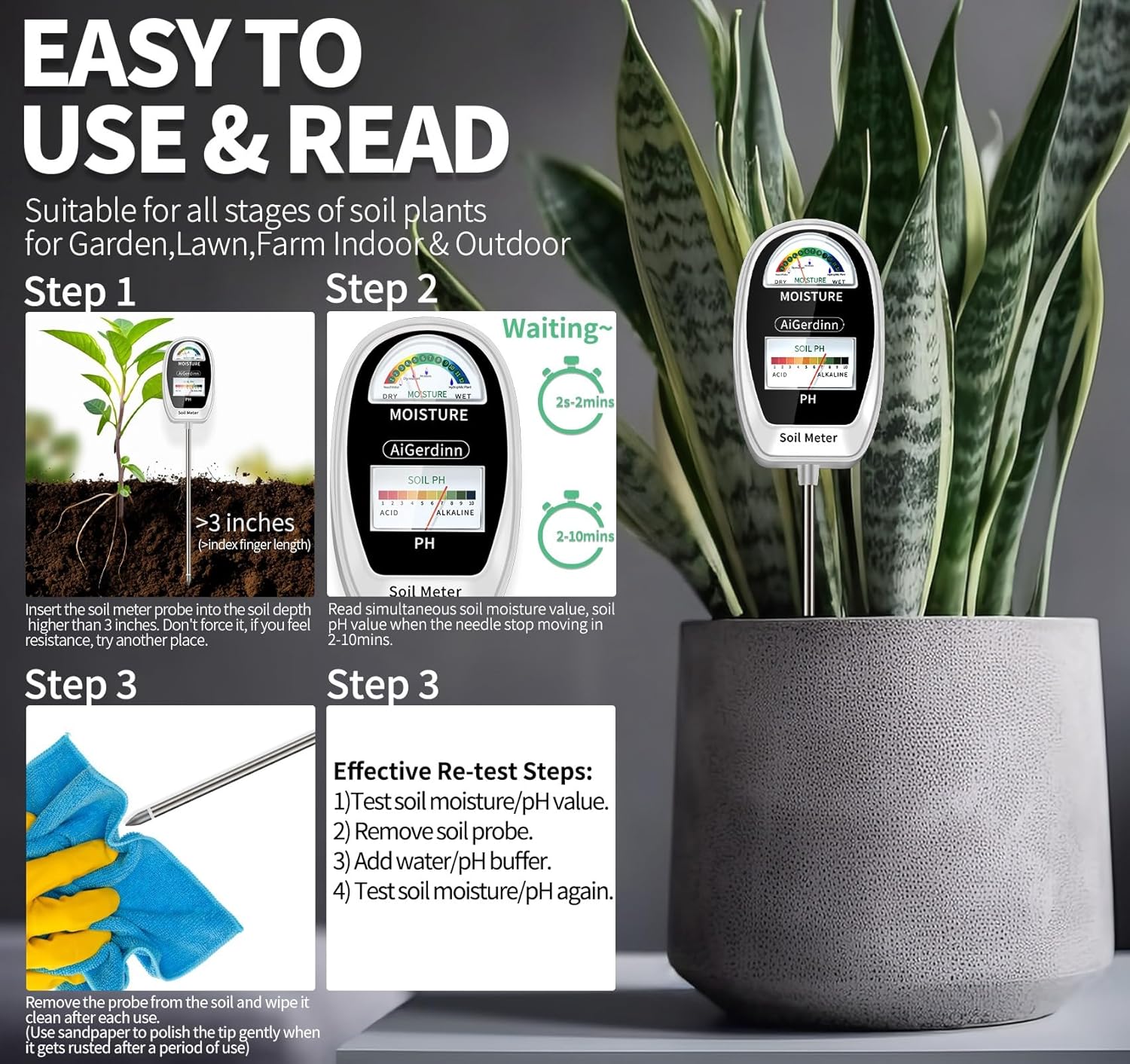 - Notes & Worry-Free Service: The 2in1 moisture meter for plants can only measure the moisture and testing pH of the SOIL, please don't test in water/any liquid. AiGerdinn provides a 365-day warranty and 24-hour friendly customer service. Please feel free to contact us if you have any issues with the 2-in-1 soil meter. We will do our best to correct the wrong, give you the best solutions, which can save your time waiting for processing progress.