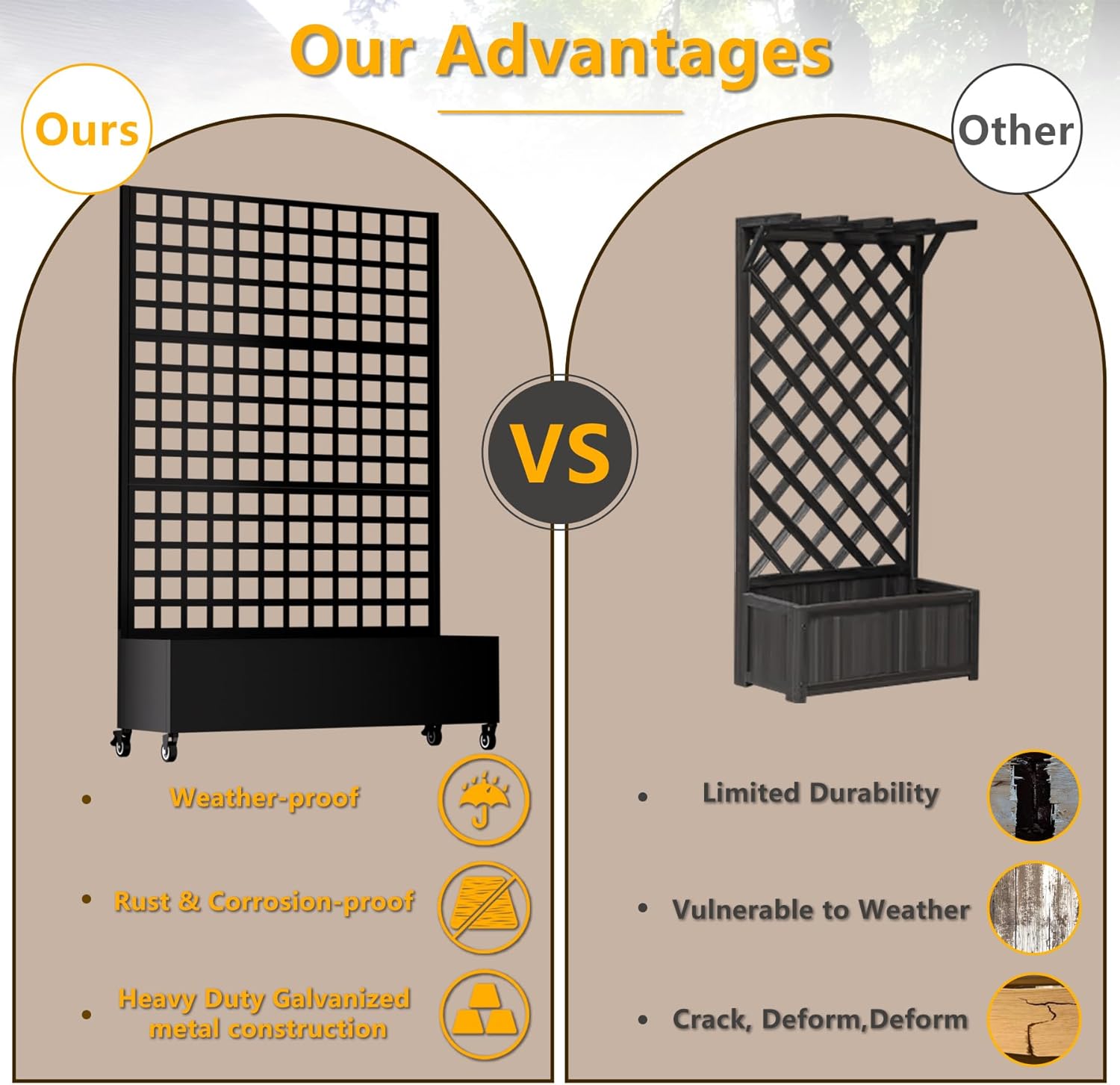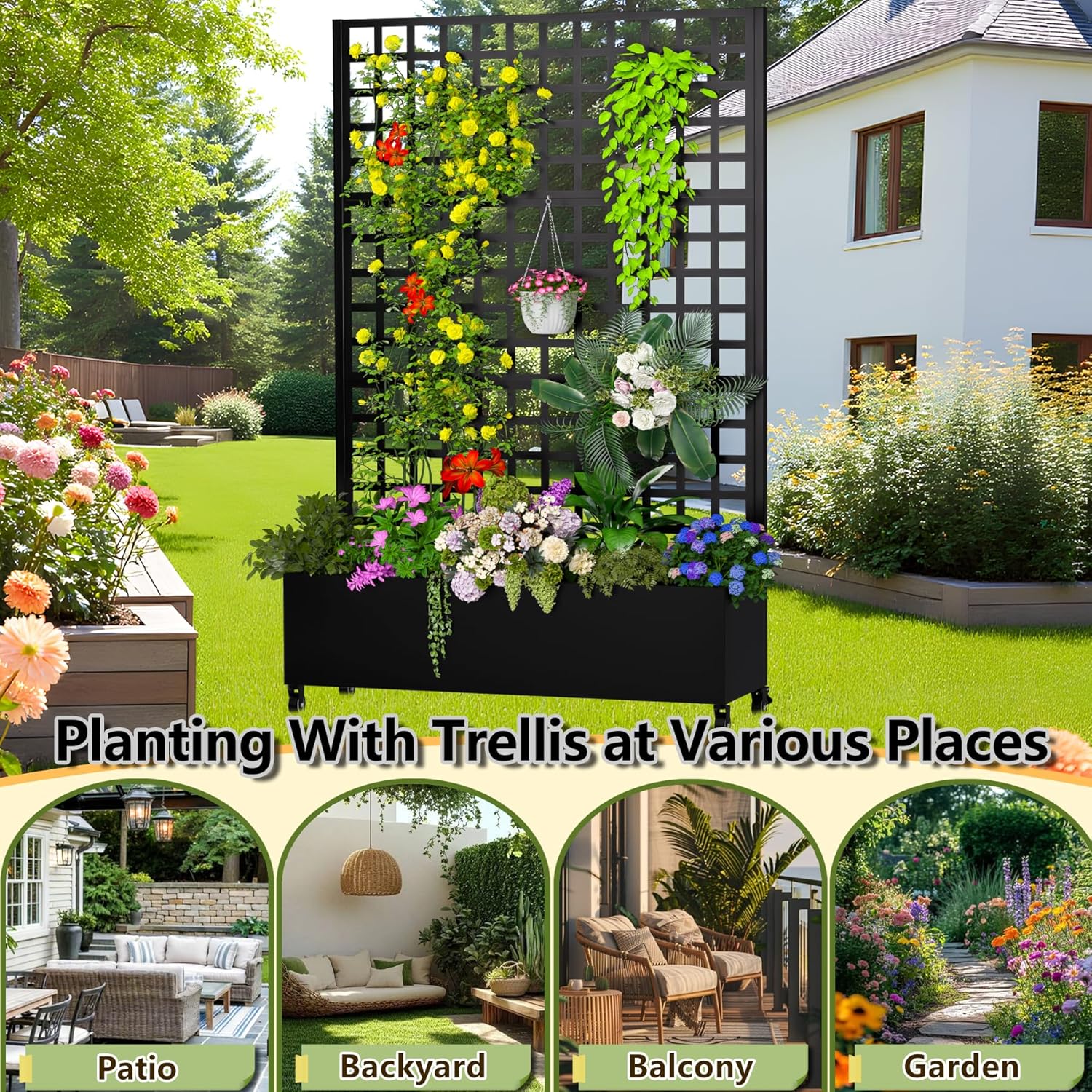 - 【3-in-1 Metal Planter Box with Trellis】This 72-inch tall metal planter box with trellis serves as an elevated garden bed for flowers, vegetables, and fruits, a sturdy support for climbing plants, and a stylish privacy screen to enhance any patio, lawn, or garden space. Perfect for versatile outdoor planting and decoration.