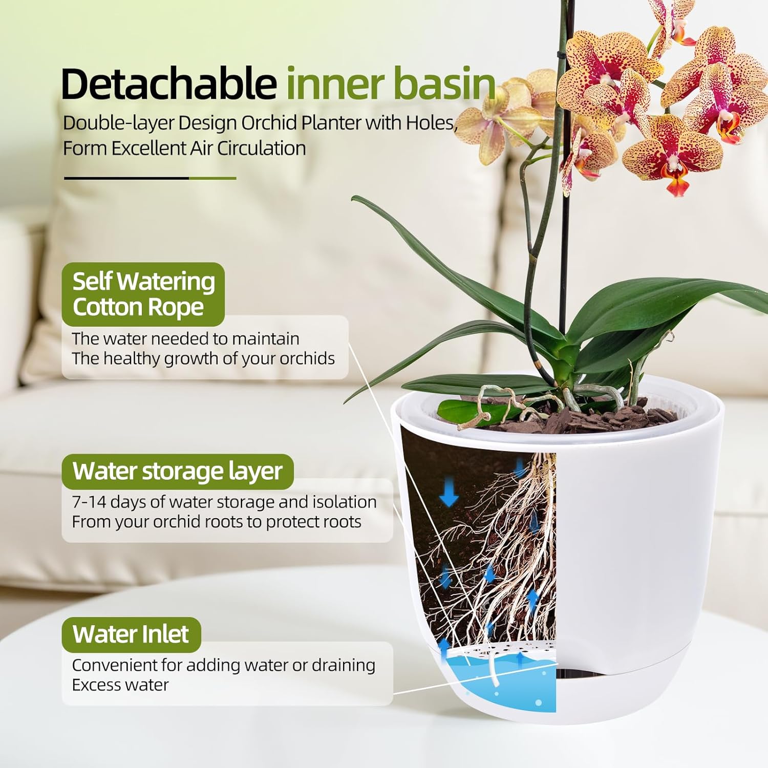 - AT EASE - SELF WATERING: Store a certain amount of water for orchids(7-14 days). The bottom of the inner-pot is always above the water surface to ensure that the roots are not submerged, and excess water will overflow from surrounding holes