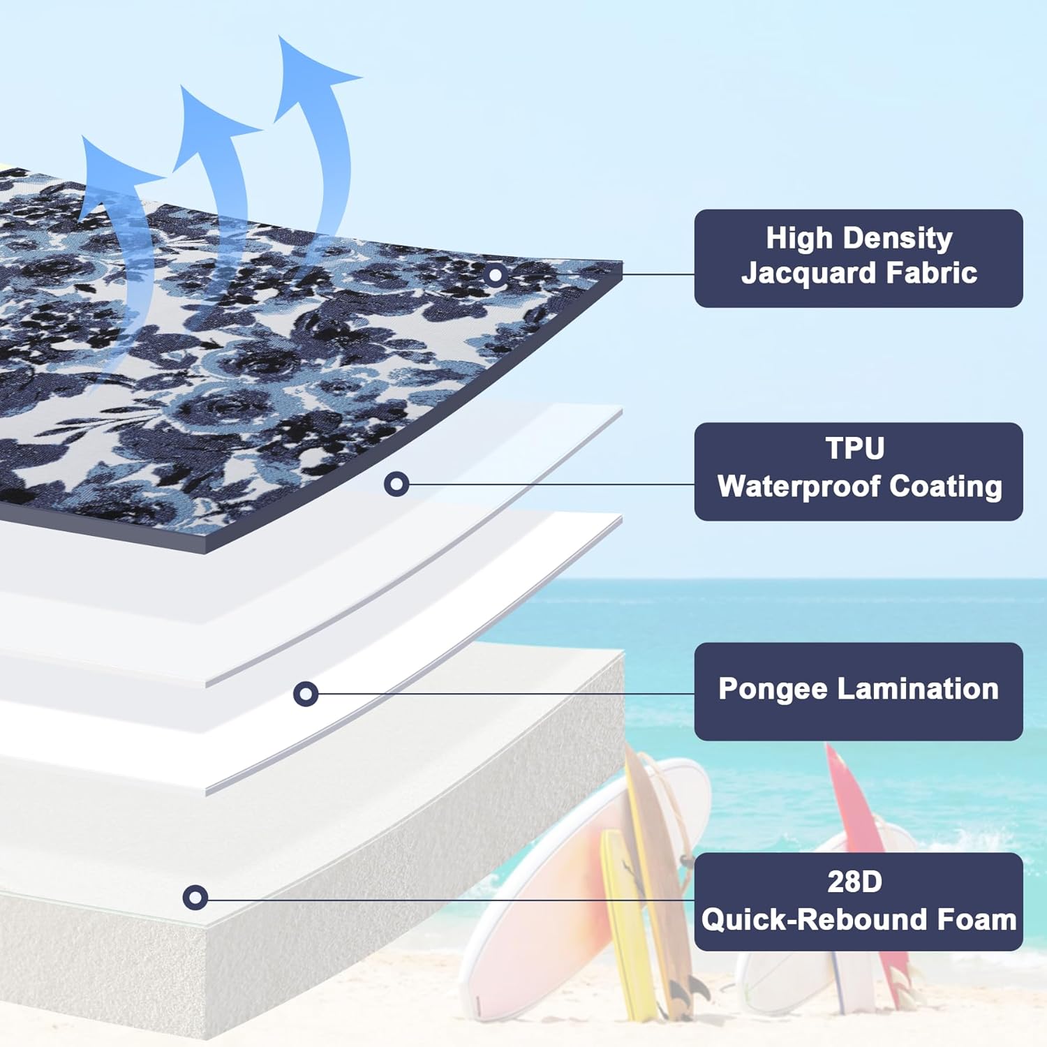 - Fade Resistant - Favoyard patio cushions are dyed using a solution dyeing technique, where the raw material is dyed before weaving to improve color fastness. This technique is also used in the jacquard fabric of the cushion covers, ensuring that the cushions retain their vibrant colors after 1,500 hours in the sun.