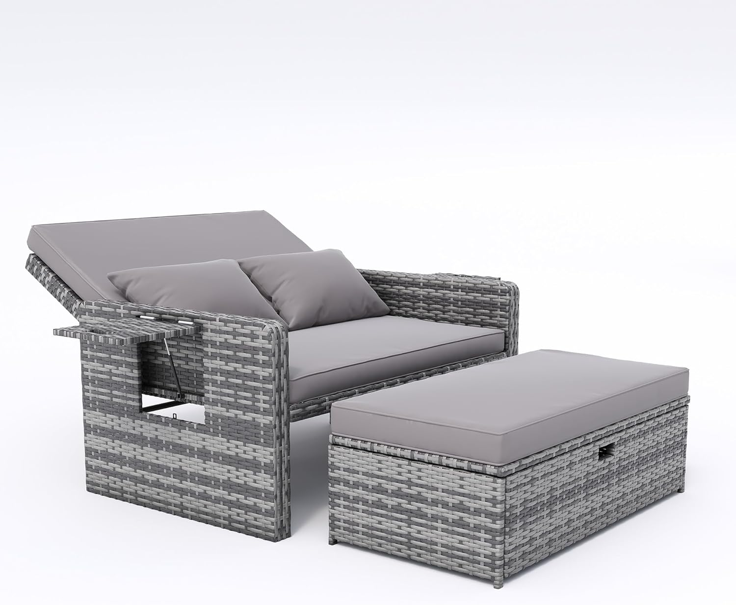 Amopatio Wicker Outdoor Daybed - Outdoor Loveseat with Storage Ottoman,4-Level Adjustable Backrest & Cushions, Patio Loveseat for Yard, Balcony, Porch, Garden, Poolside(Grey)
