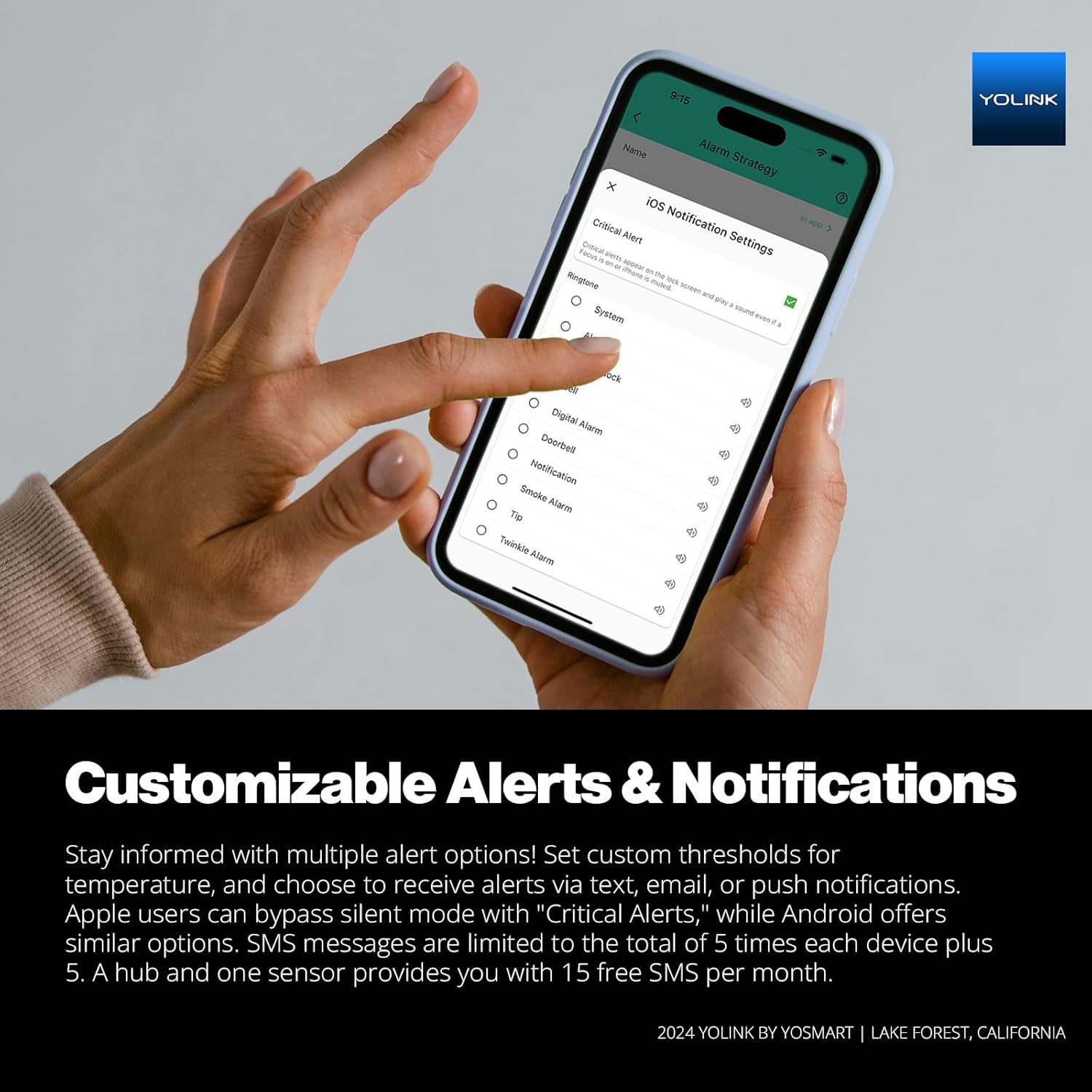 - Customizable Alerts & Notifications: Stay informed with multiple alert options! Set custom thresholds for temperature, and choose to receive alerts via text, email, or push notifications. Apple users can bypass silent mode with "Critical Alerts," while Android offers similar options. SMS messages are limited to the total of 5 times each device plus 5. A hub and one sensor provides you with 15 free SMS per month.