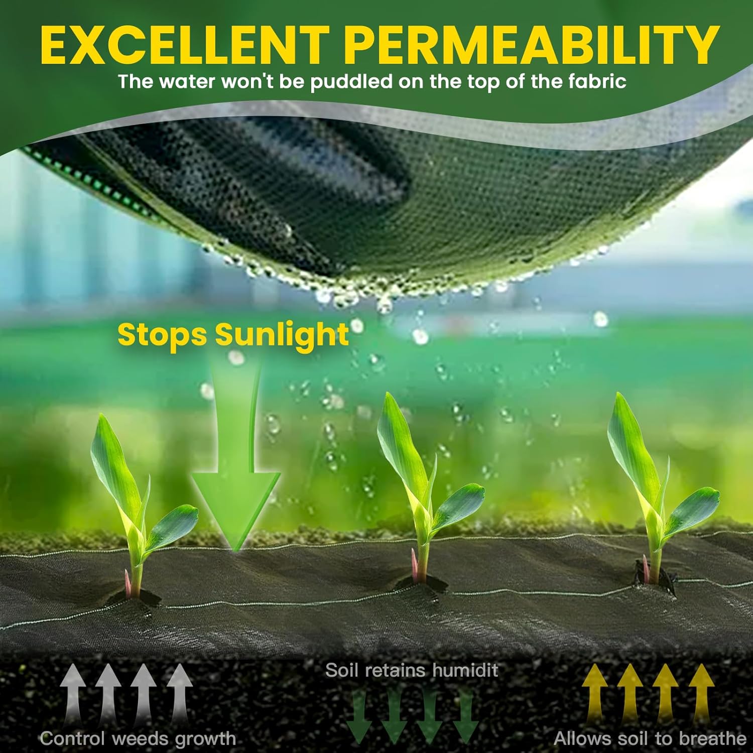 - High-Quality Garden Weed Barrier Fabric: Our garden weed barrier fabric is made of high-density, 3.5OZ woven professional-grade polypropylene, durable and not easy to tear. This weed control fabric is breathable and UV-resistant, ensuring long-lasting performance even in hot, dry climates. Garden fabric weed barrier allows air & water flow while blocking weeds, keeping soil moist and promotes plant growth, making your gardening life easier and more efficient