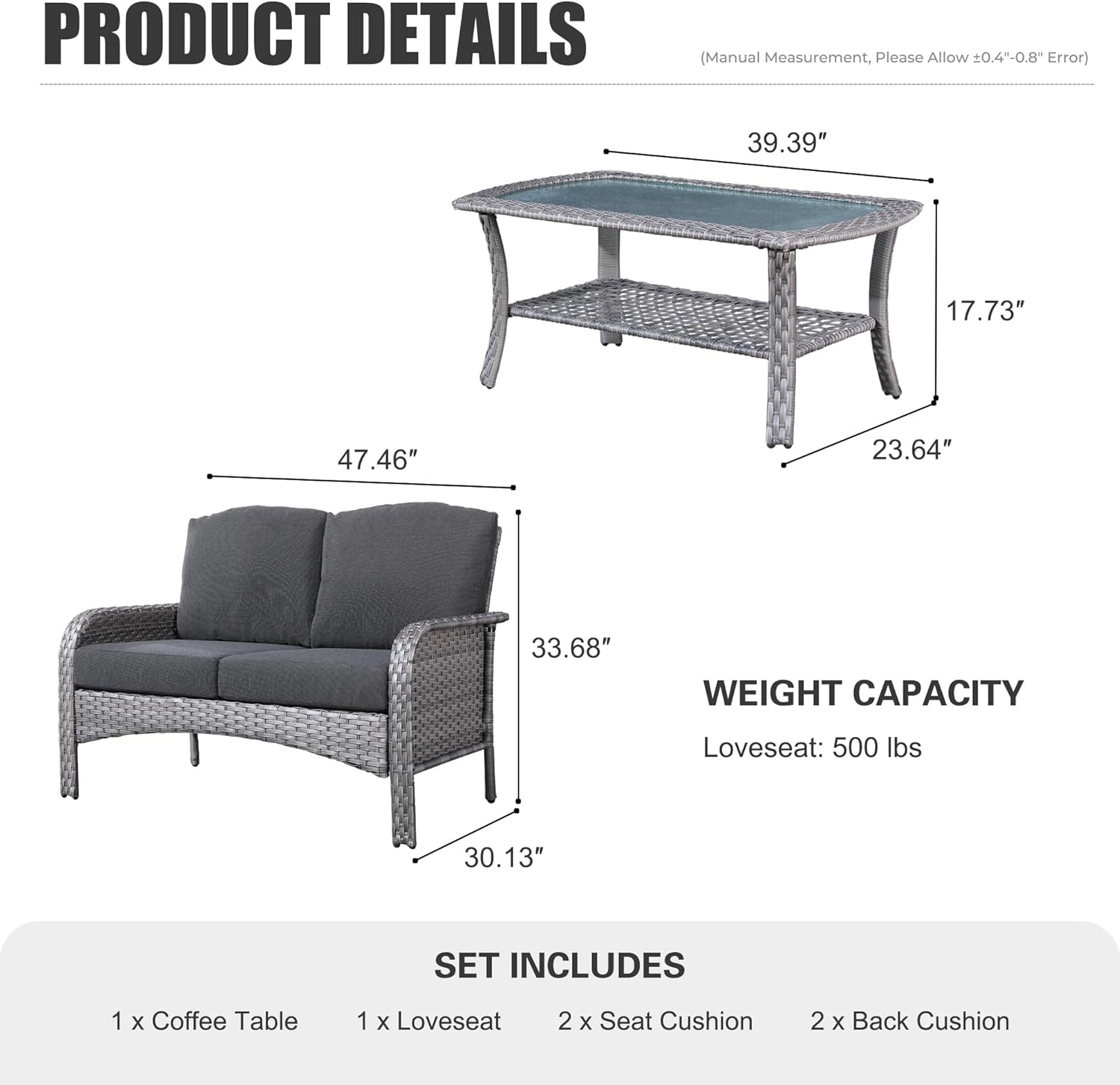 HOOOWOOO Patio Furniture Set,Outdoor High Back Loveseat Set,All Weather Wicker 2-Seater-Sofa Love Seat with Table,Black