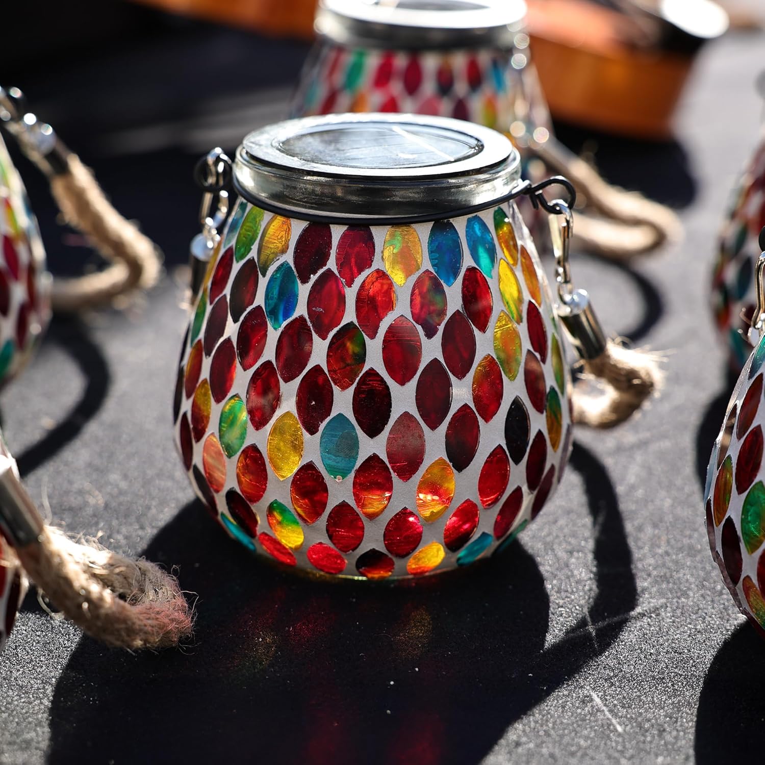 - 《Ruby Mosaic That Glows with Personality》Hand-placed oval mosaic glass tiles in rich red tones wrap around the entire lantern, creating a dazzling play of color. In the daylight, the glass refracts sunbeams like stained glass; by night, Passionate light shines through the mosaic to cast a vibrant, romantic glow in your garden.