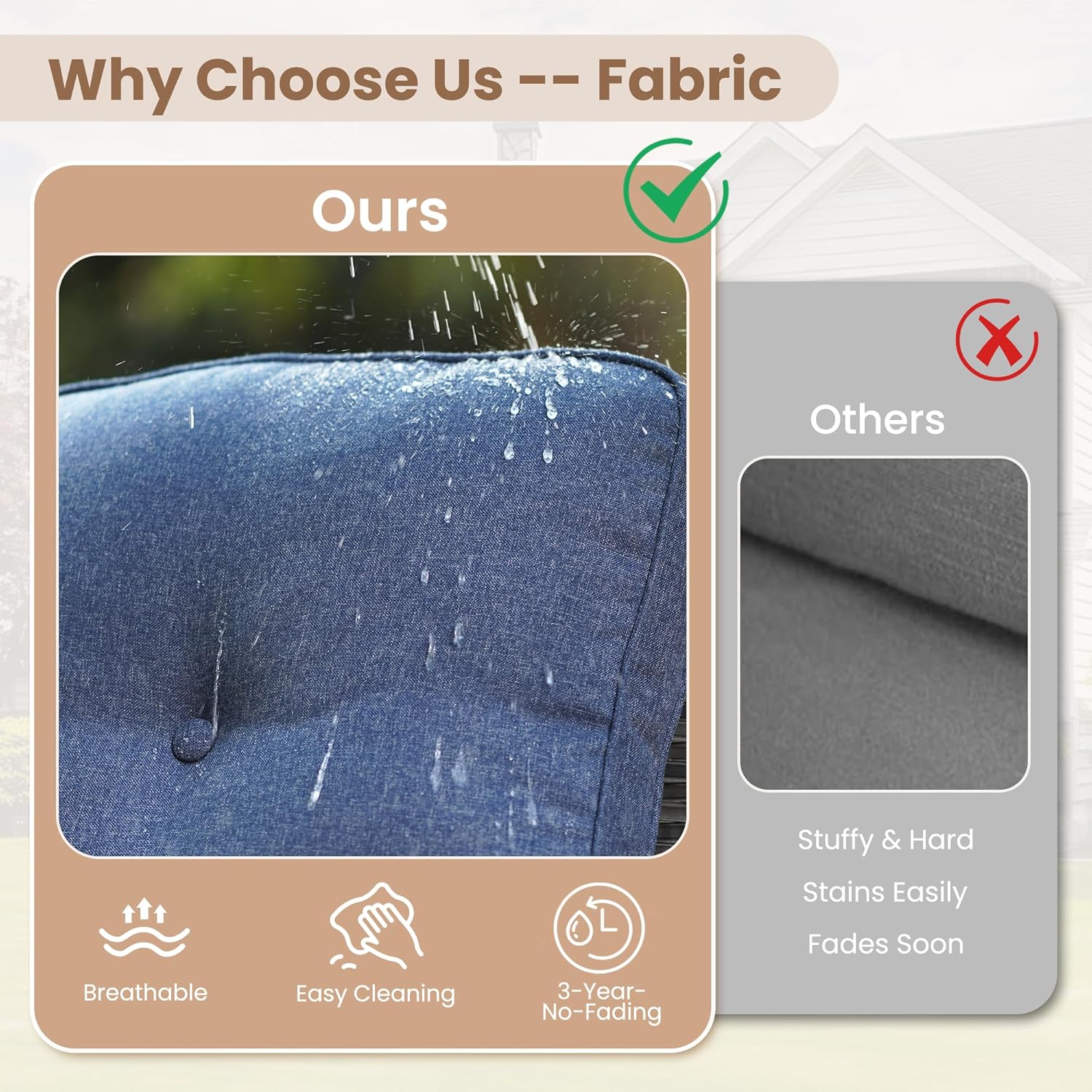 - Texture Woven Fabric: Cushions are covered by yarn dyed woven fabric, the yarns are dyed and UV treated before woven into fabric for out door fading resistant and water repellent. Looks and touches with high-end woven texture. No more worry about getting cheaply made thin print fabric. Detachable & washable