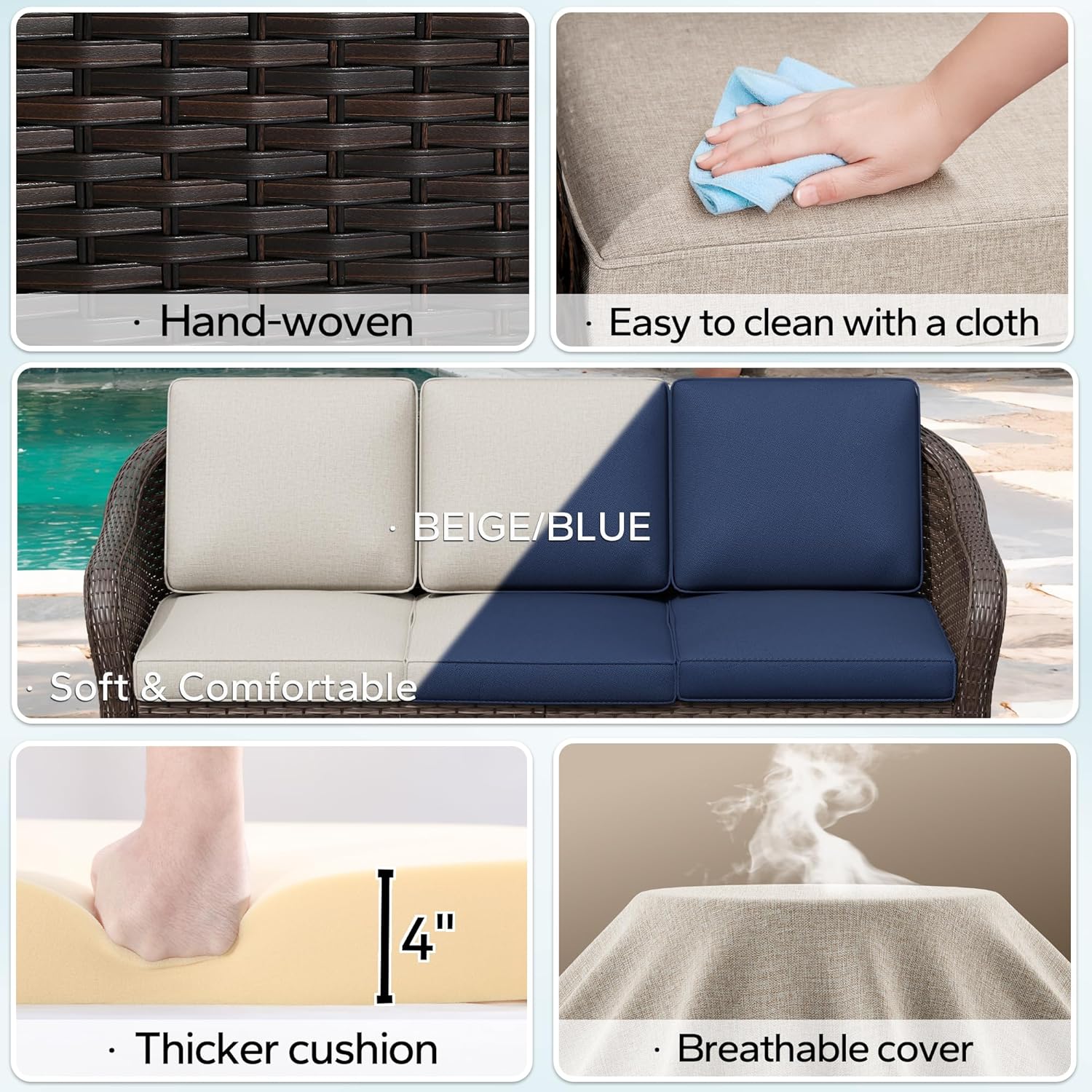 - Sturdy and Durable: The outdoor furniture set is made of steel frame and PE wicker, ensuring that it will be more sturdy. Fade-resistant fabrics of cushions is stain & fade resistance, tear & wear resistance