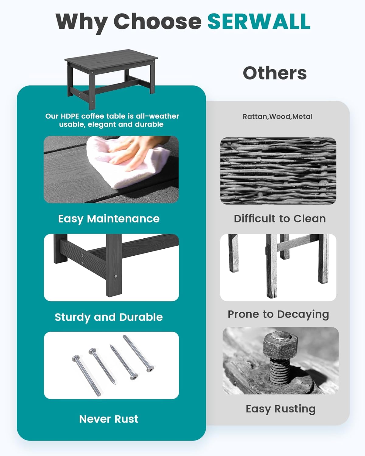 SERWALL HDPE Outdoor Coffee Table, All-Weather Patio Coffee Table, Rectangle Adirondack Outdoor Table Fits with Outdoor Sectional Couch for Outside Deck Porch Lawn, 37.8" x 22.8", Grey