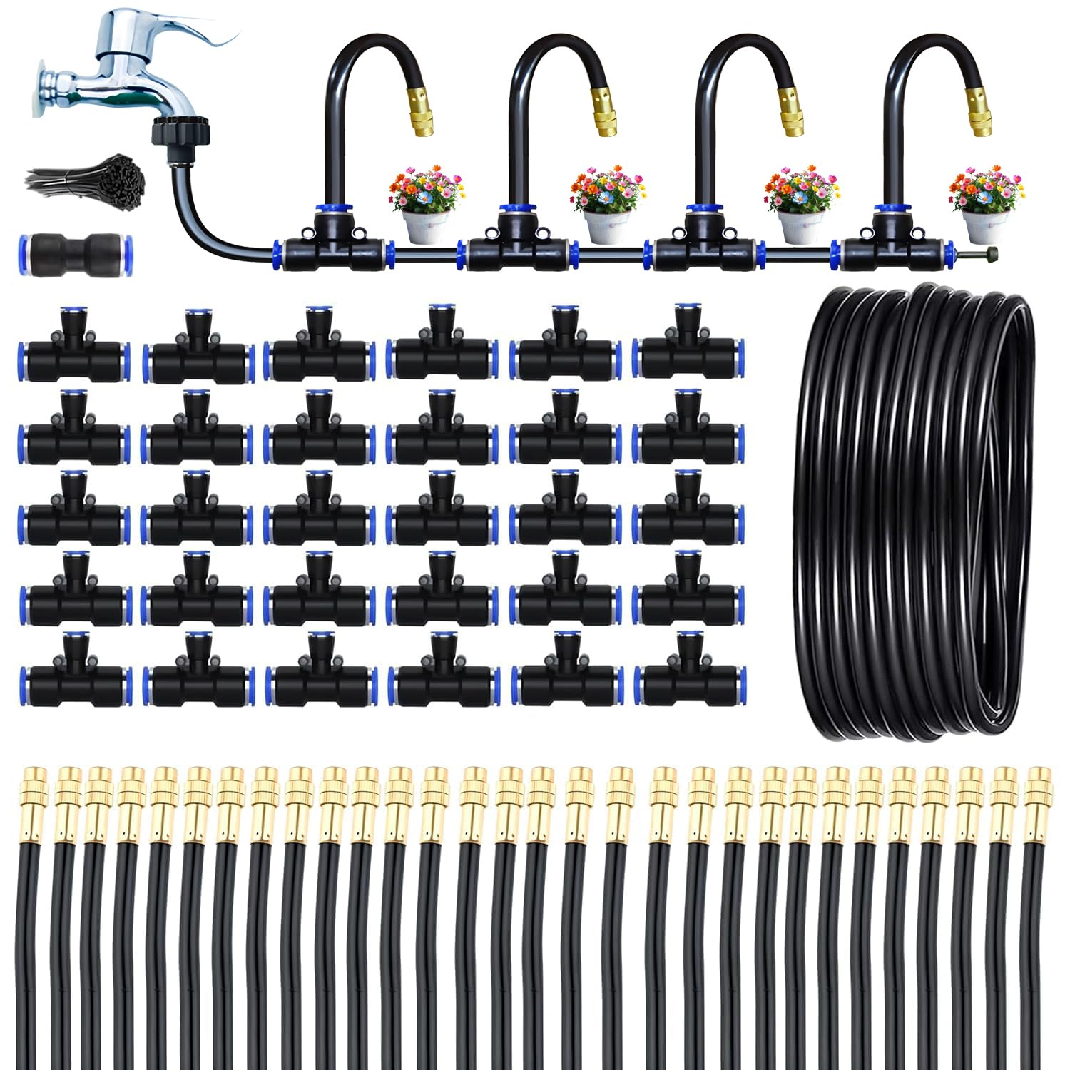 - 【Garden Irrigation System】Drip irrigation system including 98Ft hose, 30pcs 360° Misting nozzles, 30pcs T-joints(12mm-8mm-12mm), 1pcs Straight connector(12mm-12mm), 1pcs Faucet adapter(12mm), 2pcs End plug, 2pcs Adapter washer and a bundle of cable ties. Everything you need is included in this garden misting watering system.