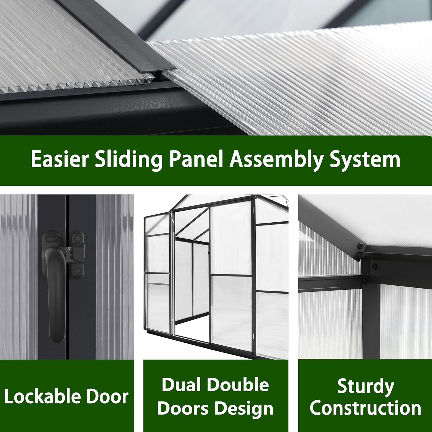 8x10 FT Outdoor Greenhouse Kit, Polycarbonate Aluminum Walk-in Greenhouse with Adjustable Roof Vent and Lockable Door, Backyard Garden in Winter, Gray