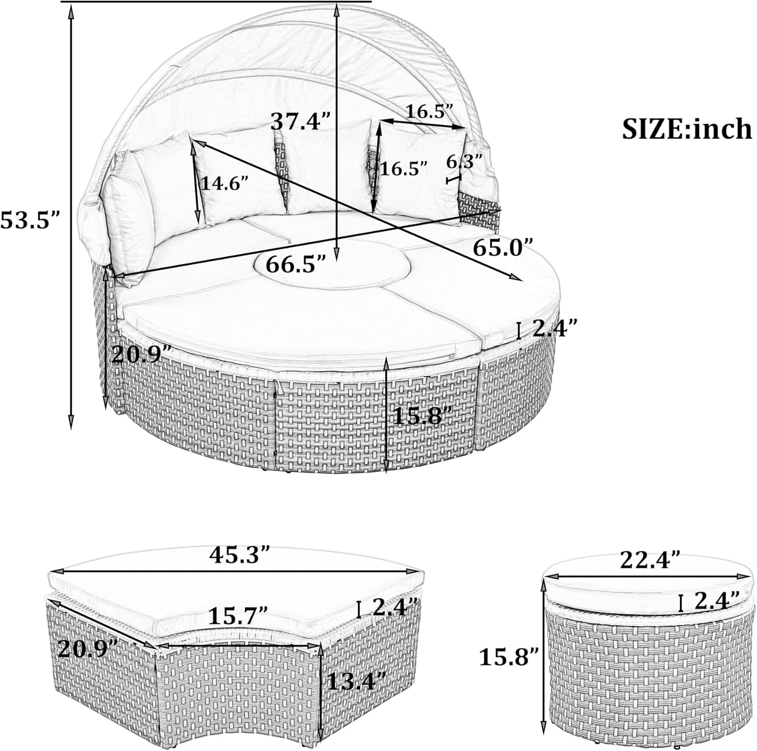 - π Versatile Comfort with a Retractable Canopy: Our round sectional sofa, which seamlessly transforms into an organized daybed. The retractable canopy, easily fastened by straps, allows you to enjoy the sun or relax in the shade on your terms.