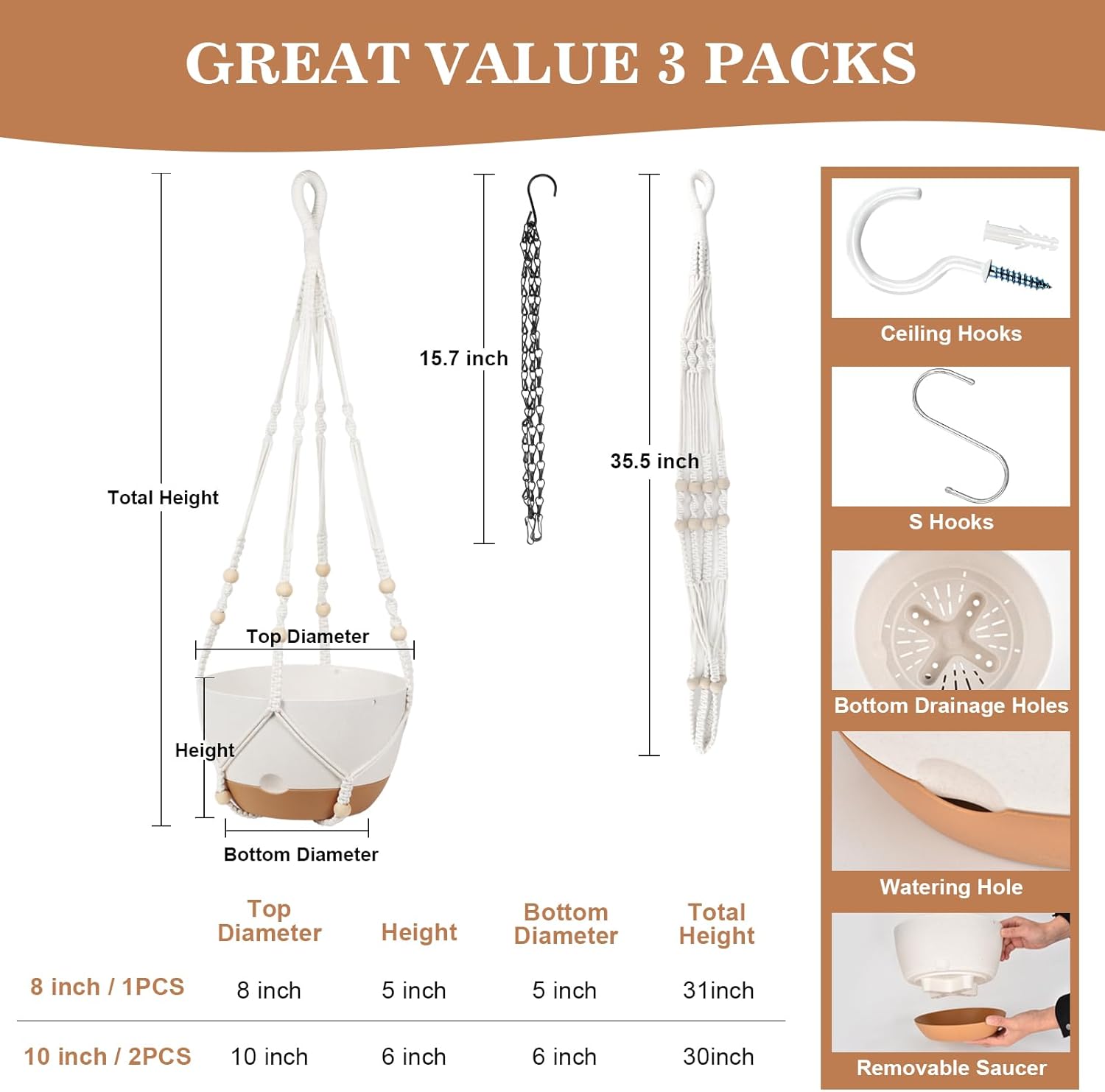- 【GREAT VALUE PACK】 - Each package includes 3pcs macrame plant hangers and chain plant hangers, 3pcs plastic selfwatering plant pots and saucers 8" / 10" / 10", and 3pcs ceiling and s hooks.
