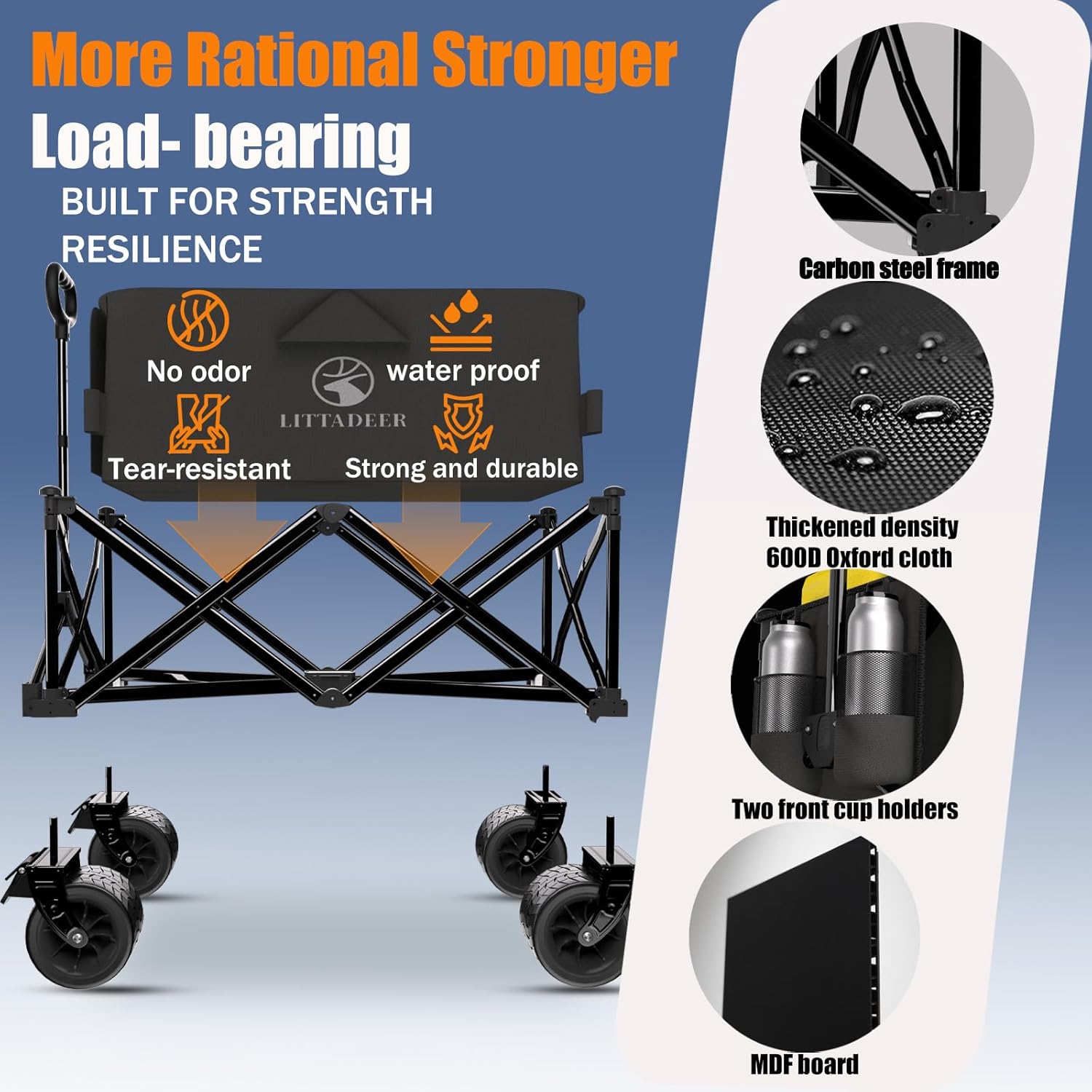 - Heavy Duty/Durable Construction:Our collapsible cart built with a robust carbon steel frame and reinforced 600D Oxford fabric, 30% increase in support intensity compared to the previous generation product.This foldable wagon has a load capacity of up to 330lbs. The MDF hollow board adds extra strength, making it perfect for heavy-duty tasks like camping, gardening, and outdoor adventures. The materials are rust-resistant, waterproof, and tear-resistant, ensuring long-lasting durability