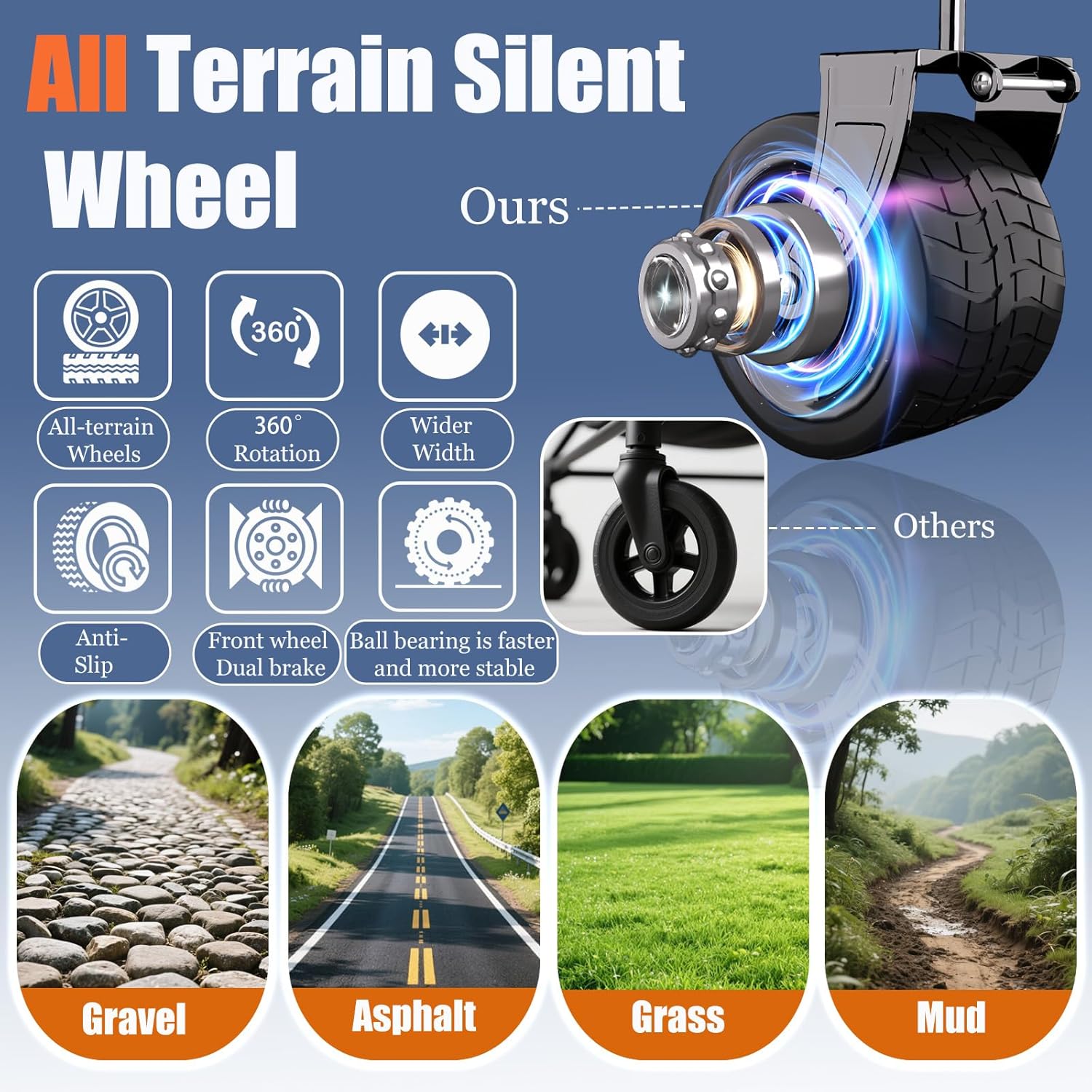 - All-Terrain Wheels for Smooth Mobility:This beach carts is equipped with 4 oversized all terrain wheels measuring 7 "x4", which can easily glide on various surfaces, including sandy, grassy, and rugged terrain. Two 360 ° rotating front wheels with brakes ensure maneuverability, while the sturdy structure provides stability even on uneven ground. Very suitable for beach travel, camping, or outdoor activities