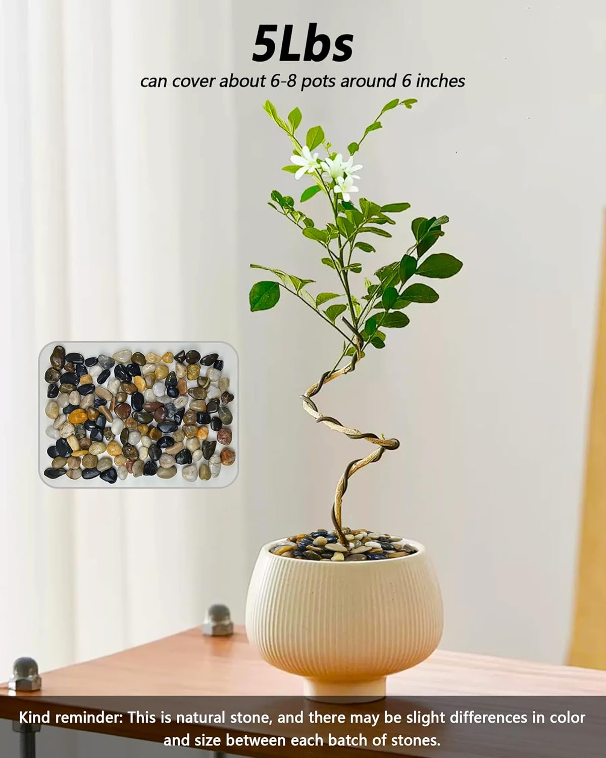 - 【Pebbles for Plants, Succulents & Pots Top Dressing】 Provides a clean, appealing finished look to succulent arrangements, potted cactus, and indoor planters, perfect for improving appearance while also serving as drainage and soil cover. One 5LB pack can cover about 6 to 8 pots (6" size) depending on layout, each pot usually needs 10-12 pcs river rocks.