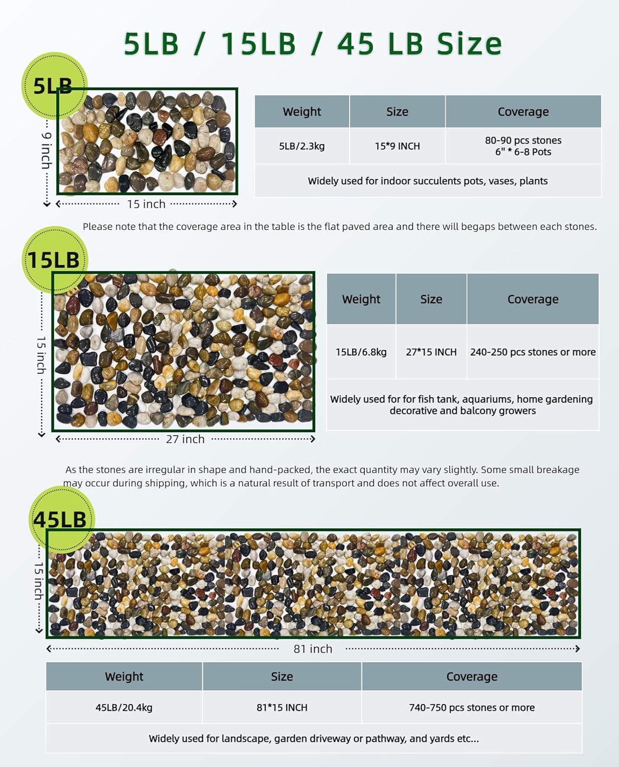 - 【5LB Mixed decorative Rocks – Middle Size & Natural】 This 5LB bag includes around 80-90 pcs smooth river stones in assorted sizes ranging from 1" to 2.2" (2.5–5.6 cm). Each stone is hand-selected, tumbled and polished for a glossy, finish — ideal for indoor or outdoor plants.