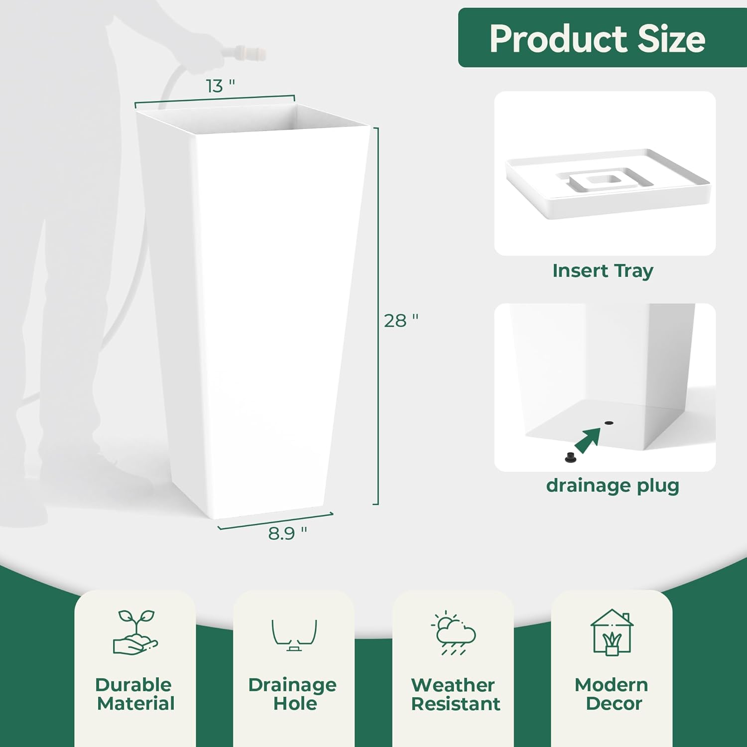 WORTH Garden Large 28 in.Tall Planters Set of 2 for Indoor and Outdoor, Heavy Duty Plastic White Modern Taper Flower Plant Pots with Drainage Hole and Dual-Purpose Tray for Front Porch, Patio