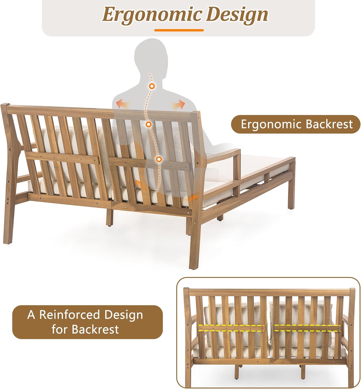 - Ergonomic Design: This outdoor day bed is equipped with an ergonomic backrest, reinforced with horizontal bars for added stability, offering superior comfort and support. The curved armrests and secure cushion straps further enhance stability and prevent slippage. The durable construction and sleek design of this patio daybed provide reliable support for outdoor relaxation