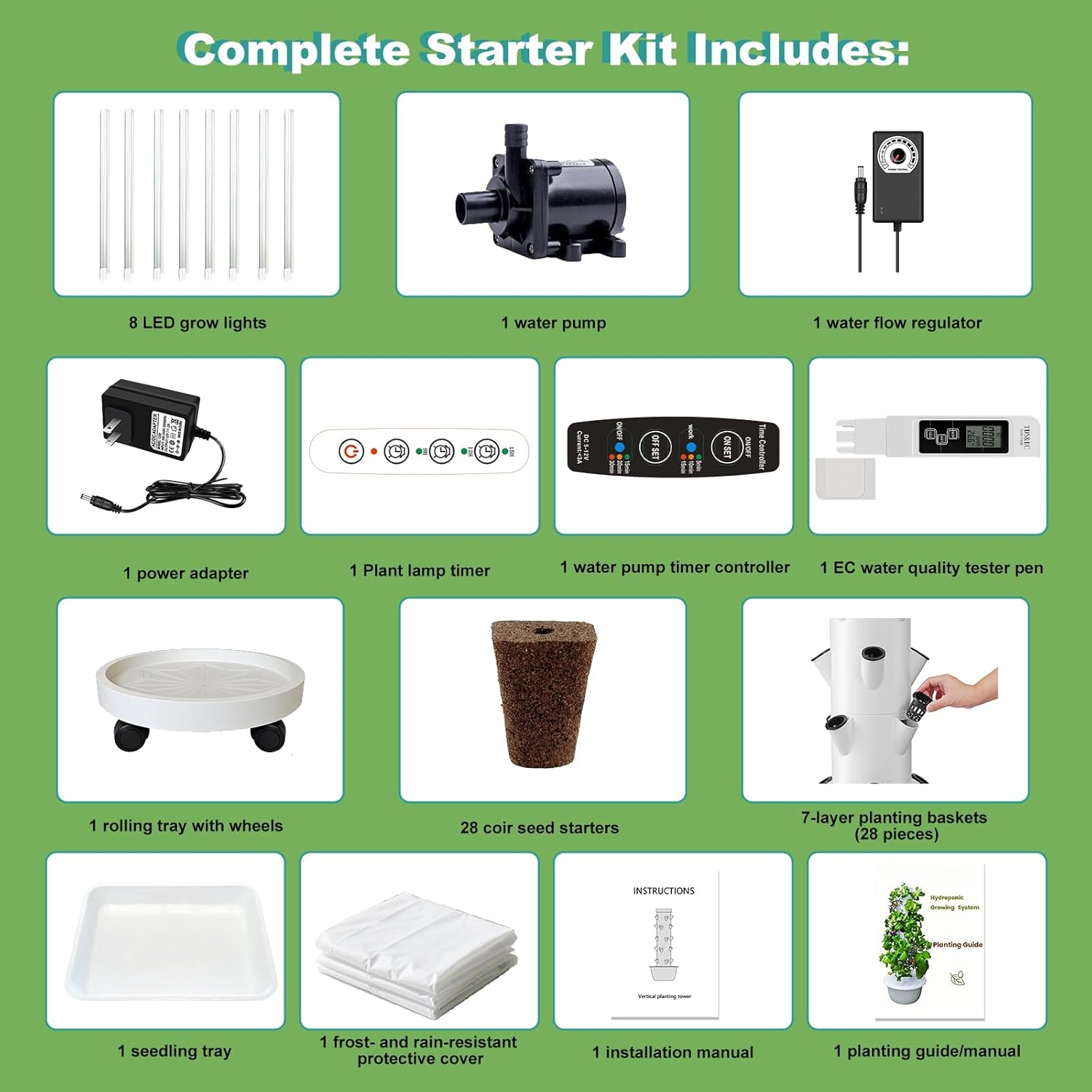 - 【Everything You Need in One Kit】 Your kit includes: 7-section hydroponic tower (28 sites), water pump, filter, flow regulator, pump timer, 8 full-spectrum LED grow tubes (removable), lighting timer, rolling base tray, 28 coconut fiber grow sponges, 28 net baskets, seedling tray, EC meter, weatherproof cover, installation manual, and planting guide. (Nutrient solution not included).Please note: This is an LED grow light package and does not include the climbing frame.