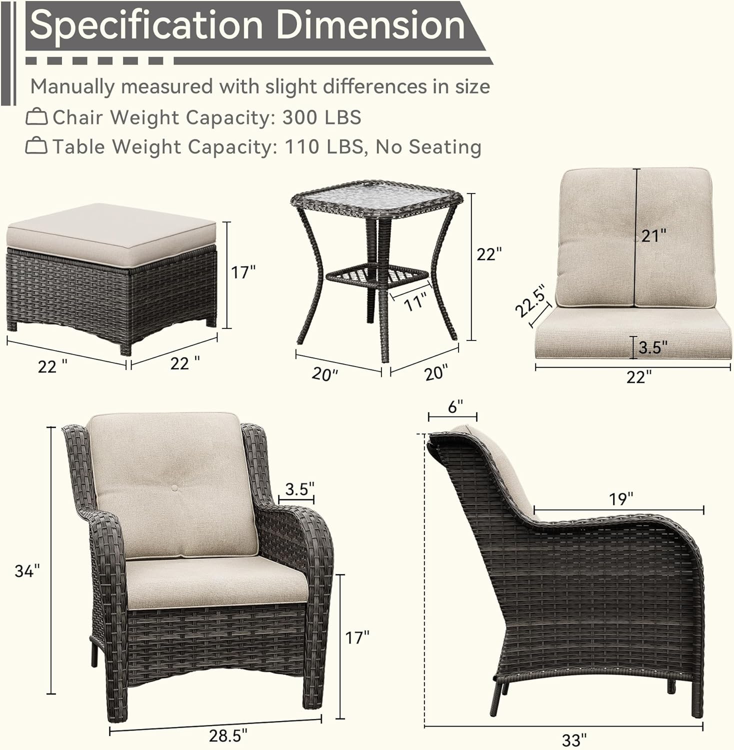 - [Specification Dimension] 31"Wx32"Dx36" H Patio Swivel Rocker Chair. Per Weight Capacity: 250-300 LBS. Measured manually, which may allow minor errors