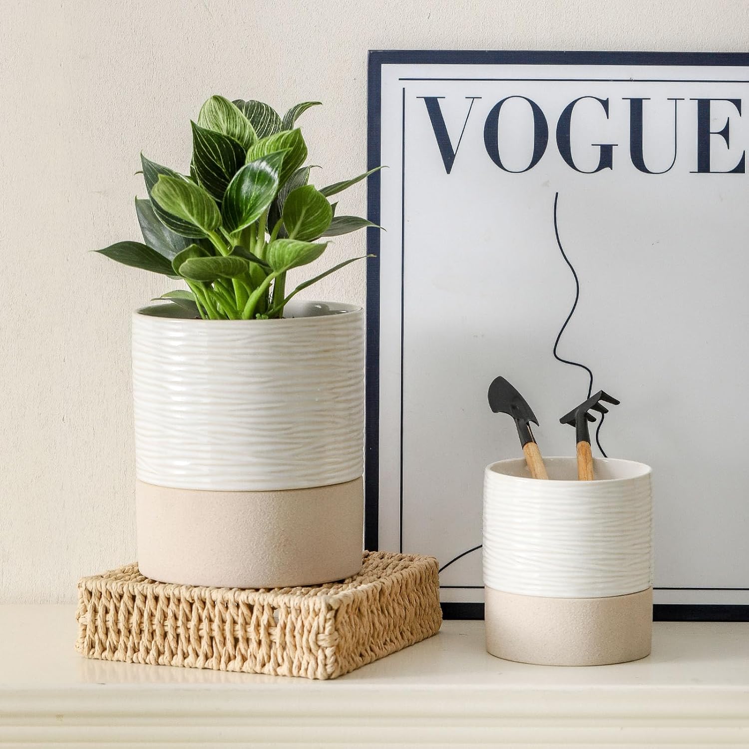 Nihow Self Watering Plant Pot for Indoor Plants: 4.5+6 Inch Ceramic Planter with Drainage Hole & Water Storage Plus - Cylinder Flower Pot with Wick for Herbs -White & Brown