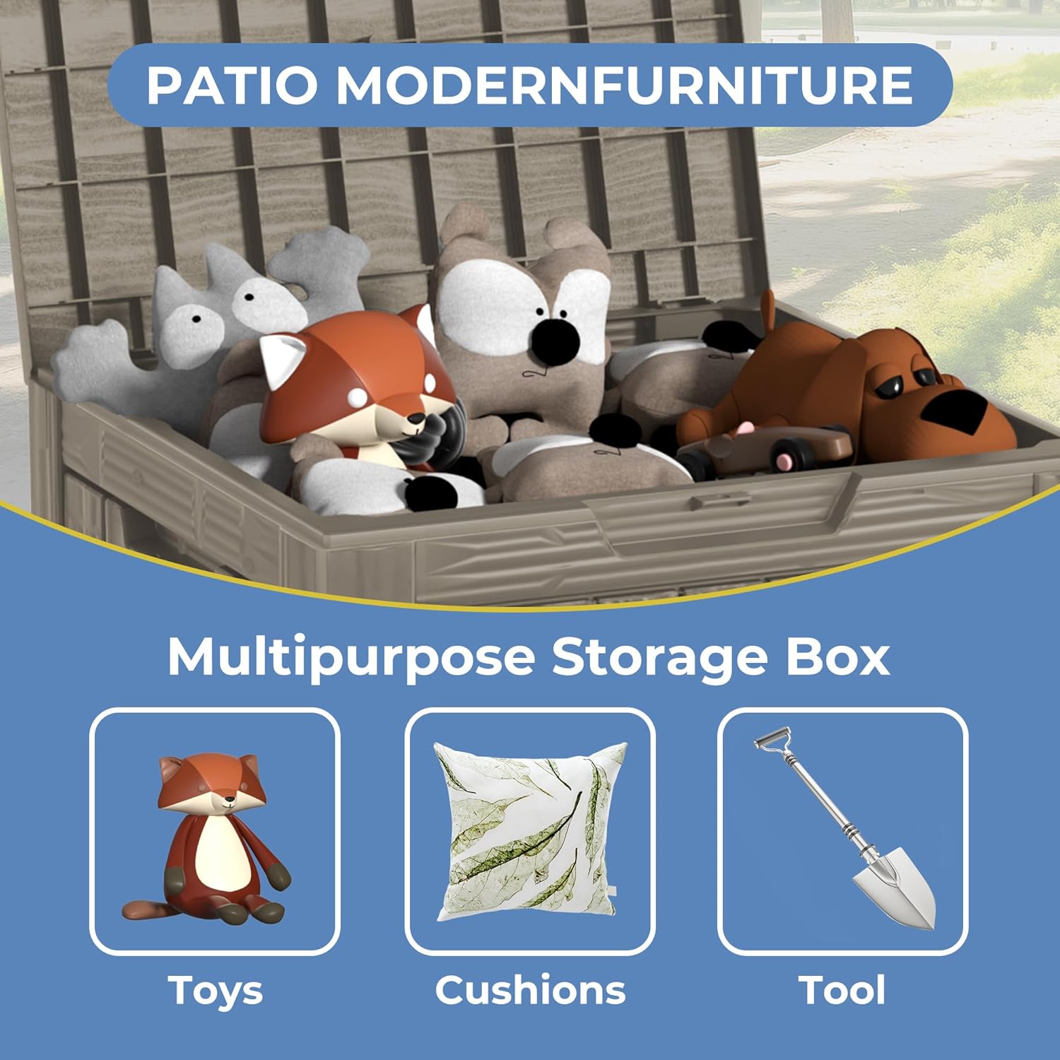 - Versatile Storage with Large Capacity Our deck box offers an impressive storage capacity, perfect for organizing patio cushions, gardening tools, pool accessories, and more. This multipurpose storage solution not only helps keep your outdoor space tidy but also functions as a bench or table. Whether in your backyard, by the pool, or on the patio, this deck box is designed to meet your every need.