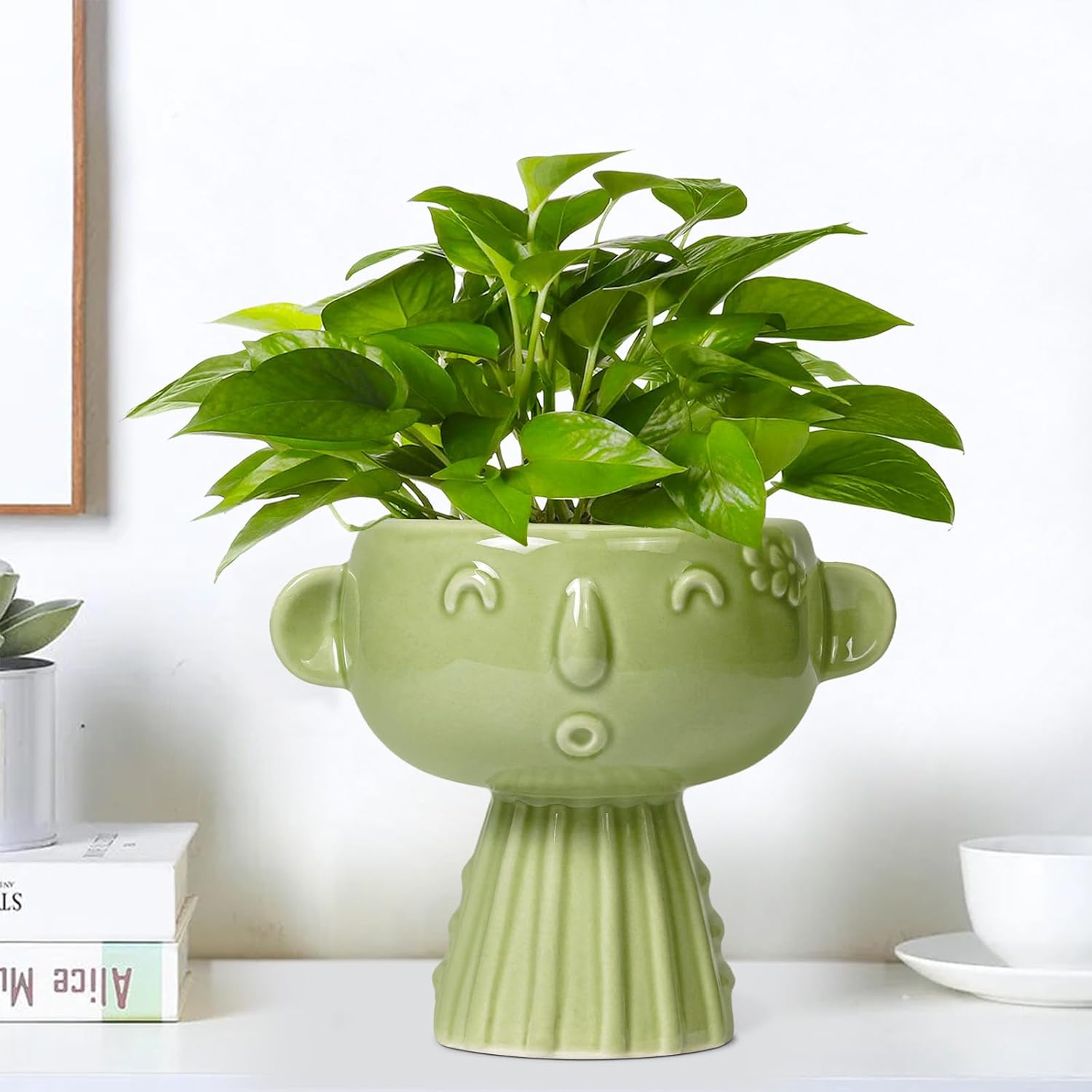 Face Planter Pot - 7 Inch Ceramic Head Planter for Indoor Plants Outdoor, Cute Succulent Flower Pots with Drainage Hole, Room Home Garden Decor, Gardening Gifts, Green