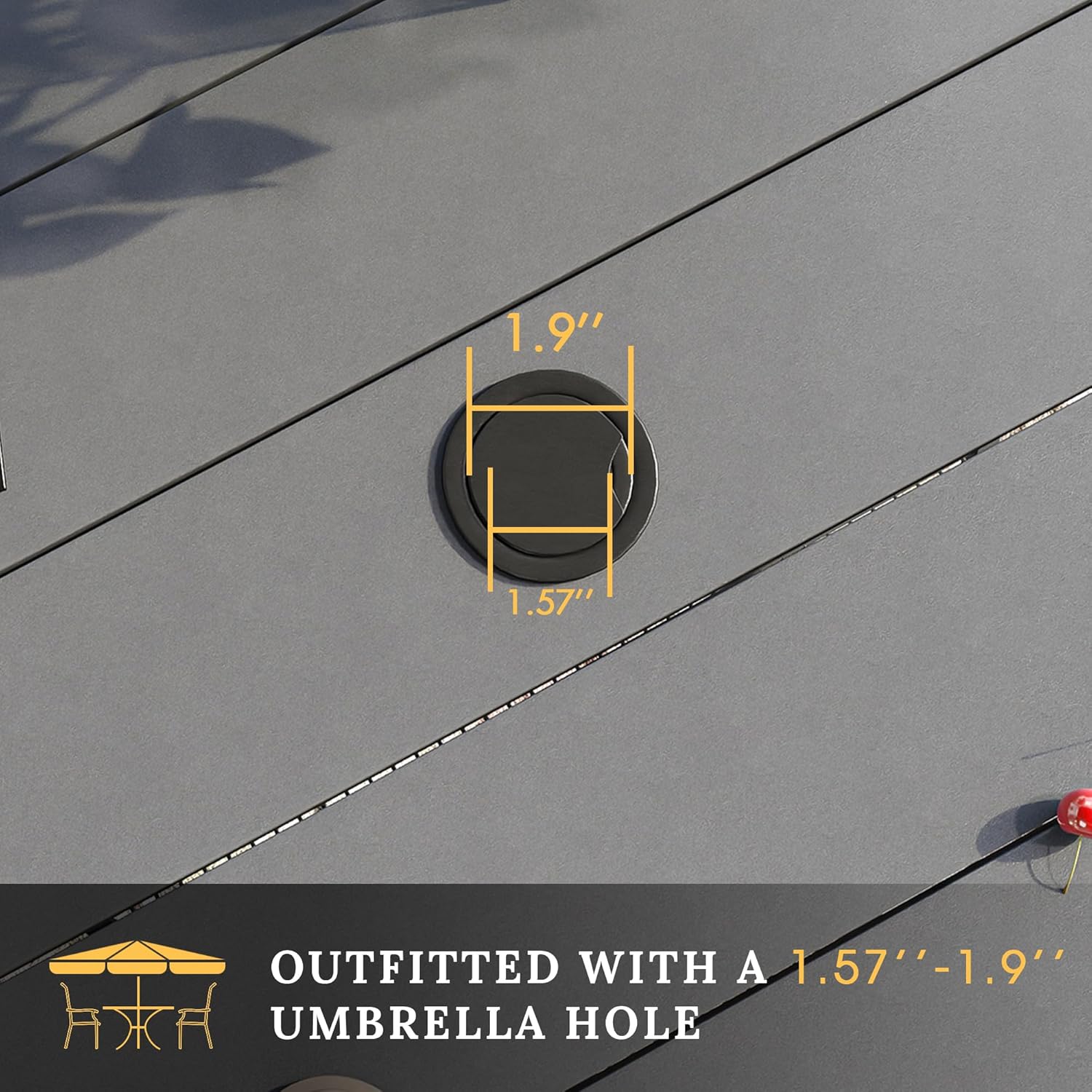 - Outfitted with an adjustable umbrella hole (1.57" -1.9", hole cover included), opening to secure an umbrella to protect your food and guests from the bright sun