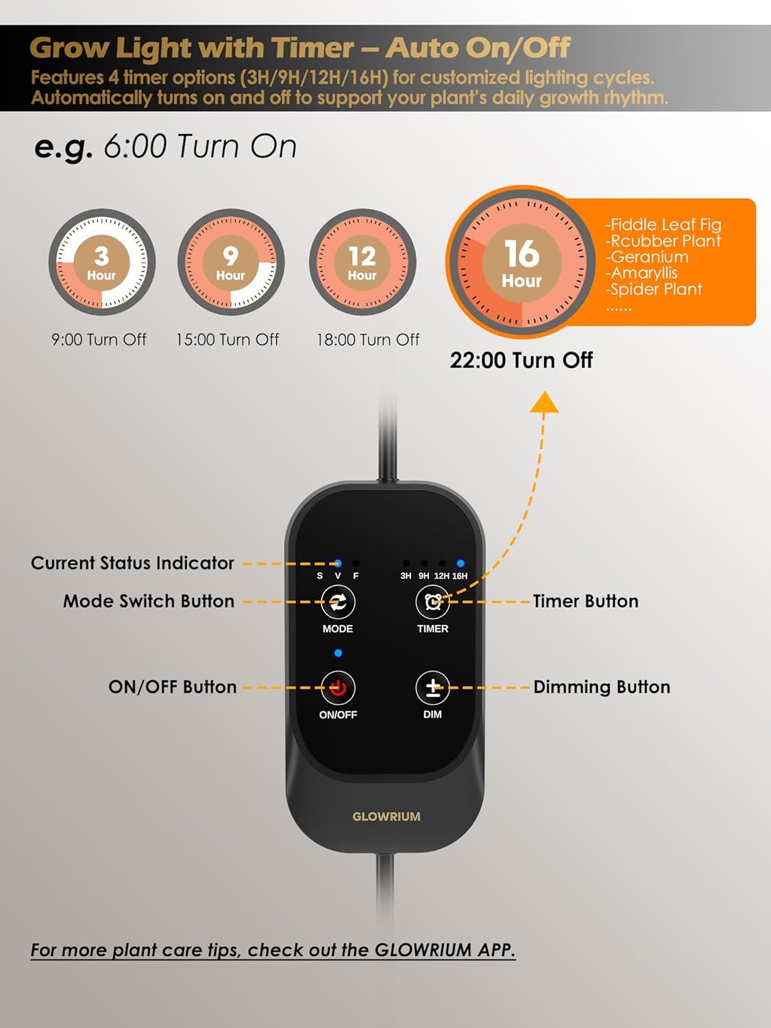 - 【Smart Timer Settings (3H/9H/12H/16H)】 Built-in timer offers 4 automatic lighting cycles. Simply set your preferred schedule, and the light will turn on and off automatically—perfect for maintaining plant care at home or while away.