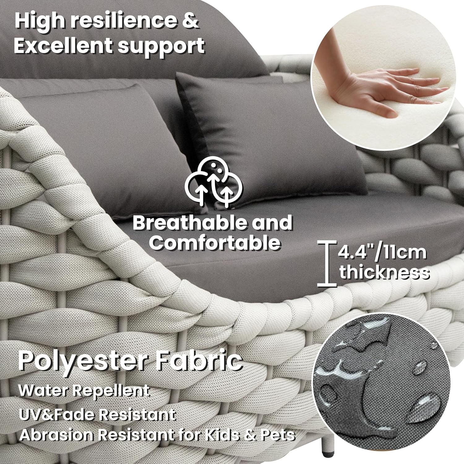 - Filled with 4.3"/11cm thick high-density foam and cotton, cushions are soft touching and breathable for a refresh comfy outdoor seating holding its shape in long time using. Water repellent and abrasion resistant polyester fabric also fits families with kids and pets