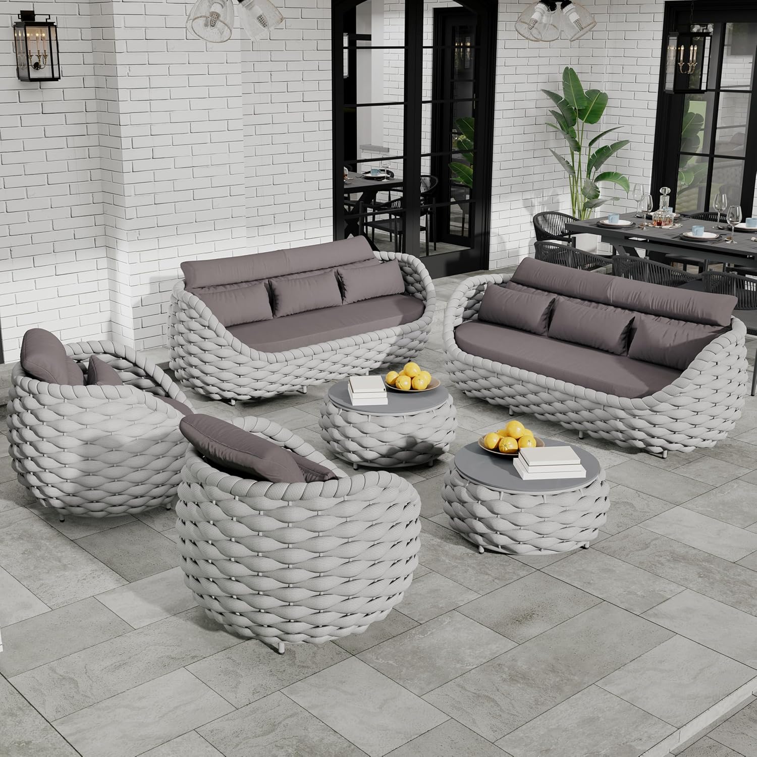 - Inspired by bird's nest shape, the Erotr assembled cushioned lounge set for 8 person combines comfort, elegance and durability. Knitted-like ropes give a warm comfy looking. Curved scoop armrest, supportive backrest and deep cushioning offer an enveloping ultimate relaxation