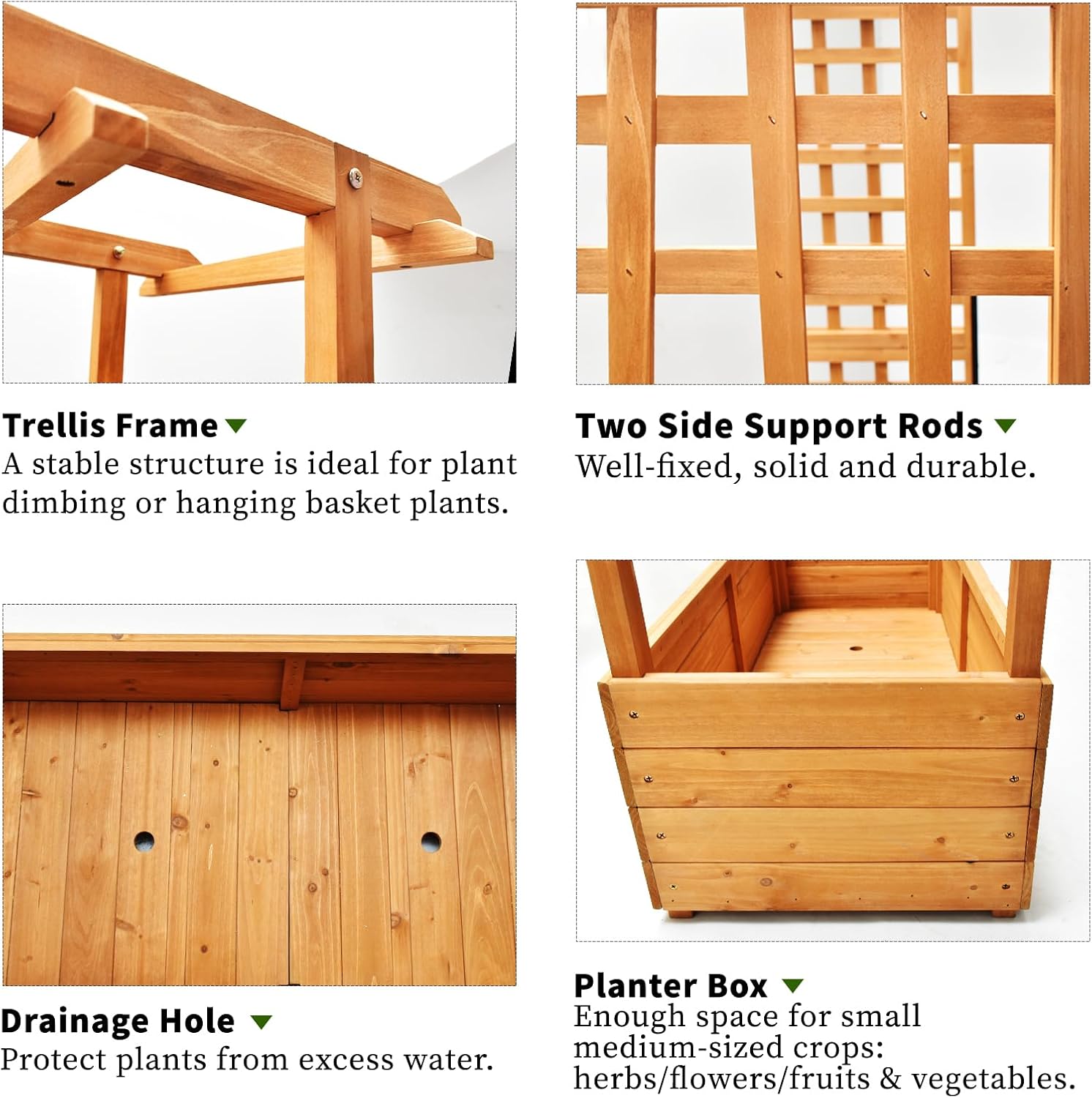 • 【Materials and Dimensions】Constructed from high-quality cedar wood, this raised garden bed with trellis is built to last. Hanging roof: 42.5” L x 17.3” W; Side trellis: 14.2” W x 55.5” H; Planter box: 34.6” L x 14.9” W x 10.6” H; Overall: 42.5" L x 17.3" W x 66.1" H.