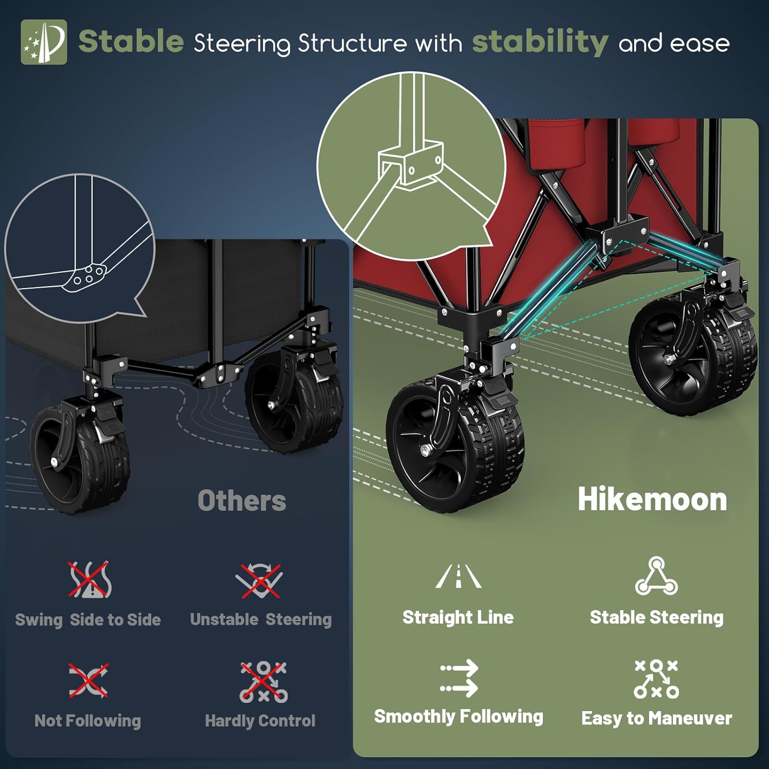 - ใ๐๐๐ญ๐๐ง๐ญ๐๐ ๐๐ญ๐๐๐ฅ๐ ๐๐ญ๐๐๐ซ๐ข๐ง๐ ๐๐ญ๐ซ๐ฎ๐๐ญ๐ฎ๐ซ๐ & ๐๐๐ฃ๐ฎ๐ฌ๐ญ๐๐๐ฅ๐ ๐๐๐ง๐๐ฅ๐ ๐ ๐จ๐ฅ๐๐๐๐ฅ๐ ๐๐๐ ๐จ๐ง ๐๐๐ซ๐ญ๐ฌใ: The upgraded stable steering structure ensures the folding wagon moves in a straight line without swaying or wheel collision. The handle can be rotated 90ยฐ forward and backward, making it easier for people of different heights to use. The rebound function keeps the handle upright, so you donโt have to bend over to reach it. These designs make the wagon easy, stable, and maneuverable to pull and steer.