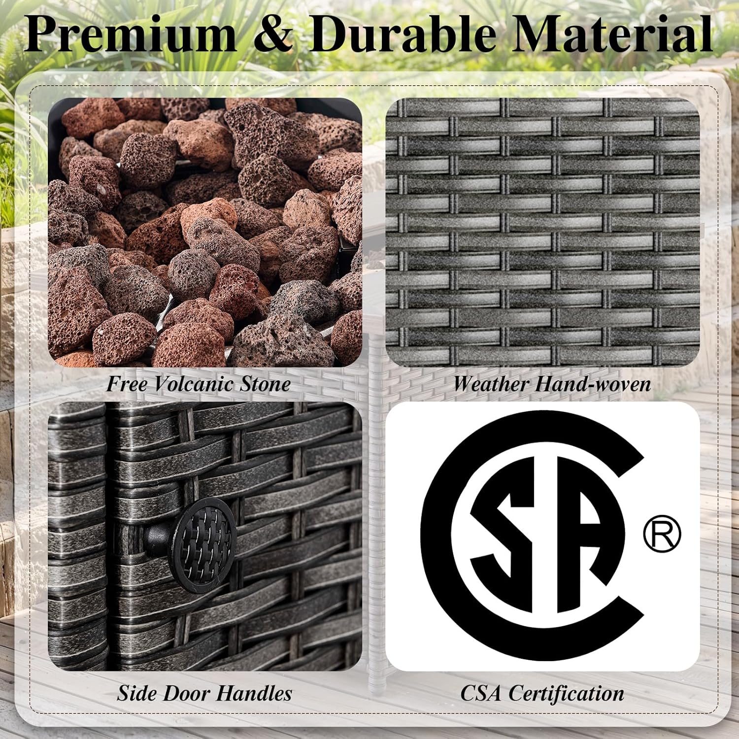 - Auto-ignition Fire Pit:The gas fire pit table has a heat output of 50,000 BTUs and is equipped with an integrated electronic ignition,It is CSA certified and undergo rigorous inspection and testing before leaving the factory to ensure reliability and safety.It can be used as a coffee table with the lid.