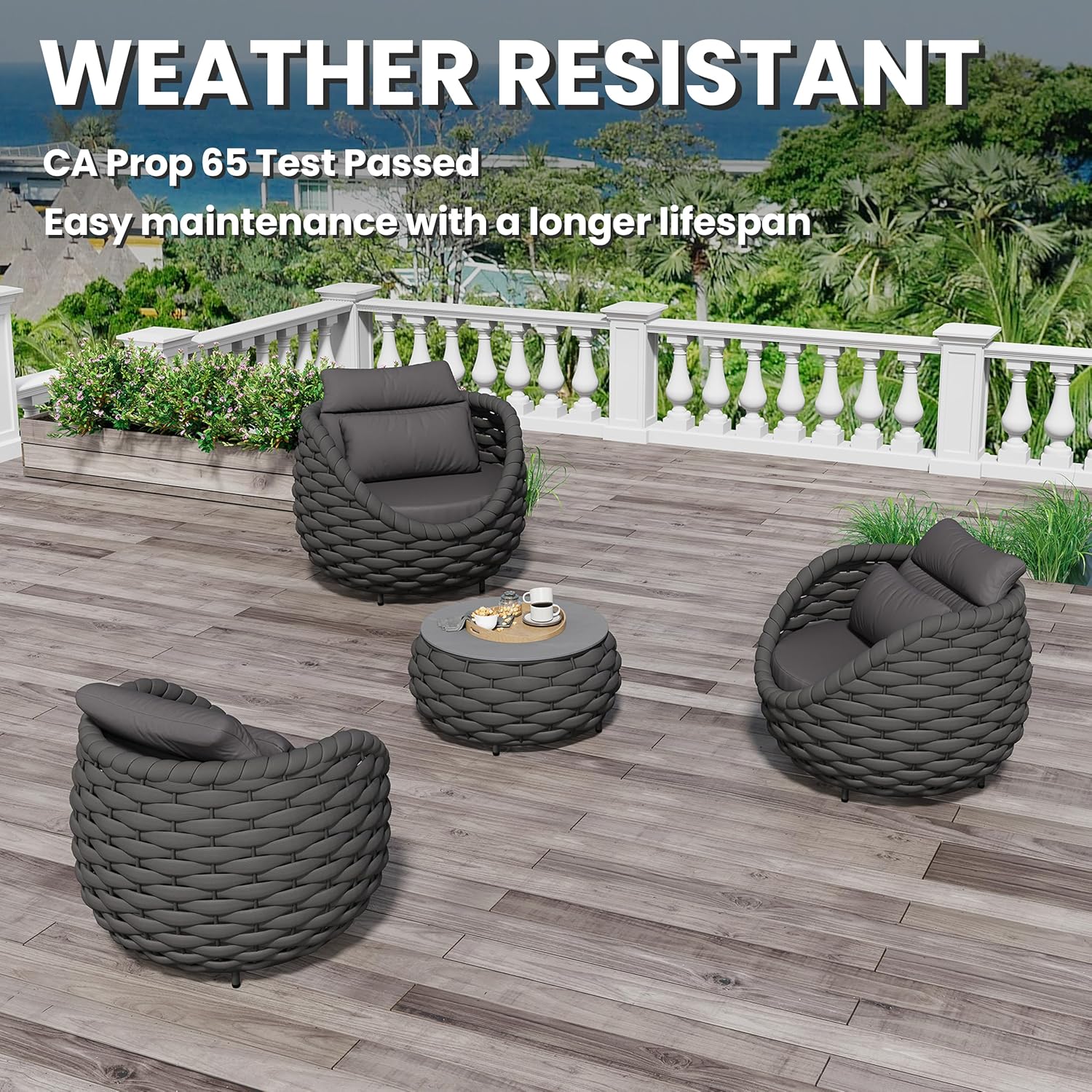 - Woven rope patio set includes: 3*single armchairs, 1*coffee table. Size: Single chair: 34.3''(L)X34.3''(W)X27.6''(H) holds up to 400 lbs/181.5kg; Side table: 28.4''(L)X28.4''(W)X14.2''(H) holds up to 176 lbs/80kg. Color: Dark gray rope and dark gray fabric