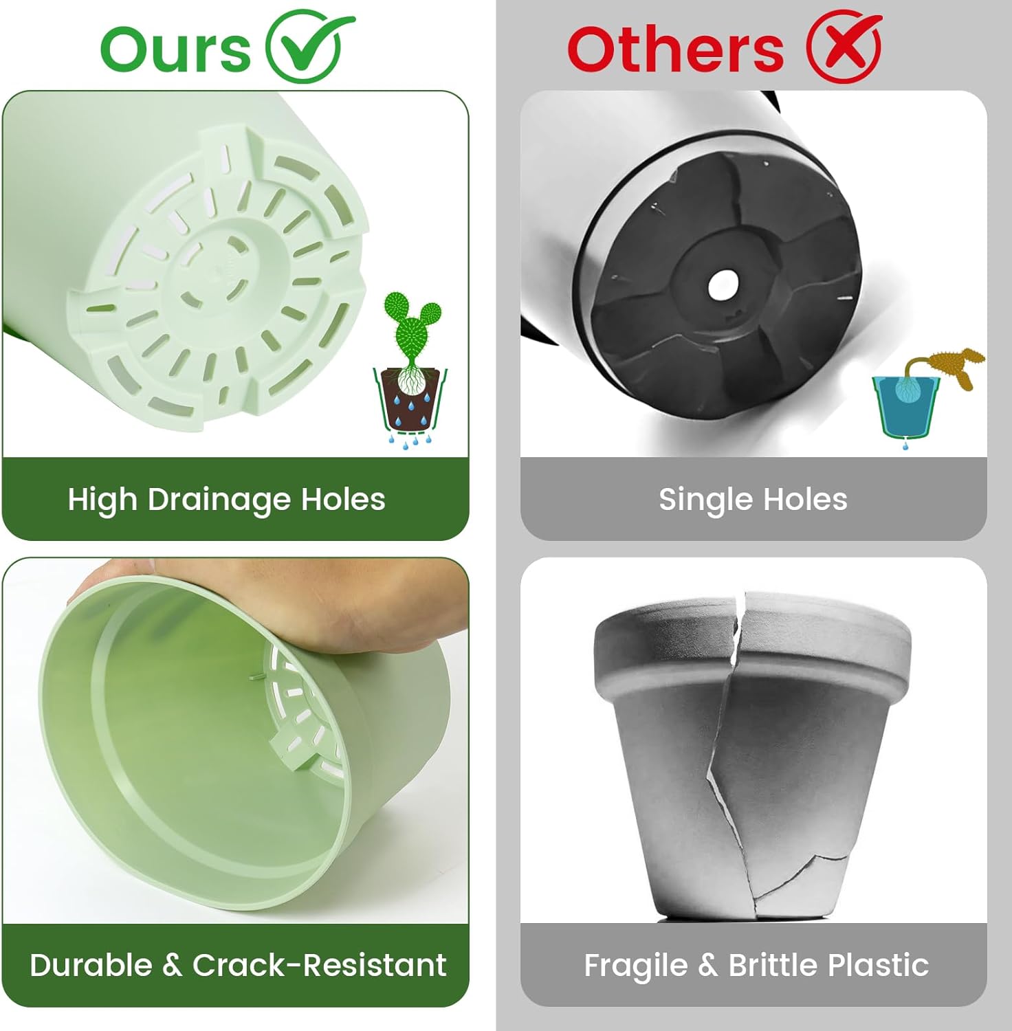 - [Drainage System Designed for Healthy Roots] These 6 inch plant pots feature multiple drainage holes at the bottom to promote airflow and prevent waterlogging. Matching saucers help catch excess water and reduce mess, making them ideal plant pots with drainage for both indoor and outdoor use.