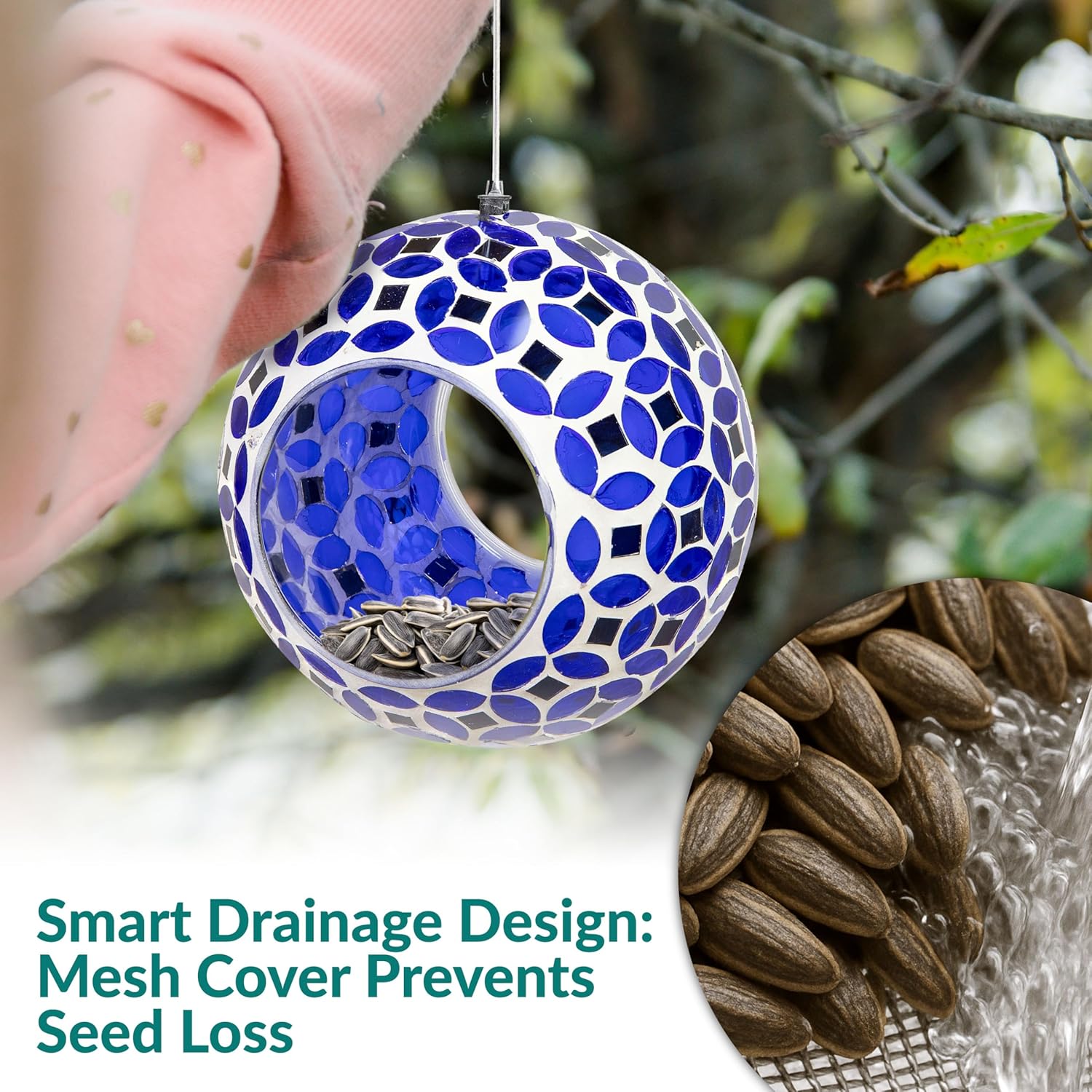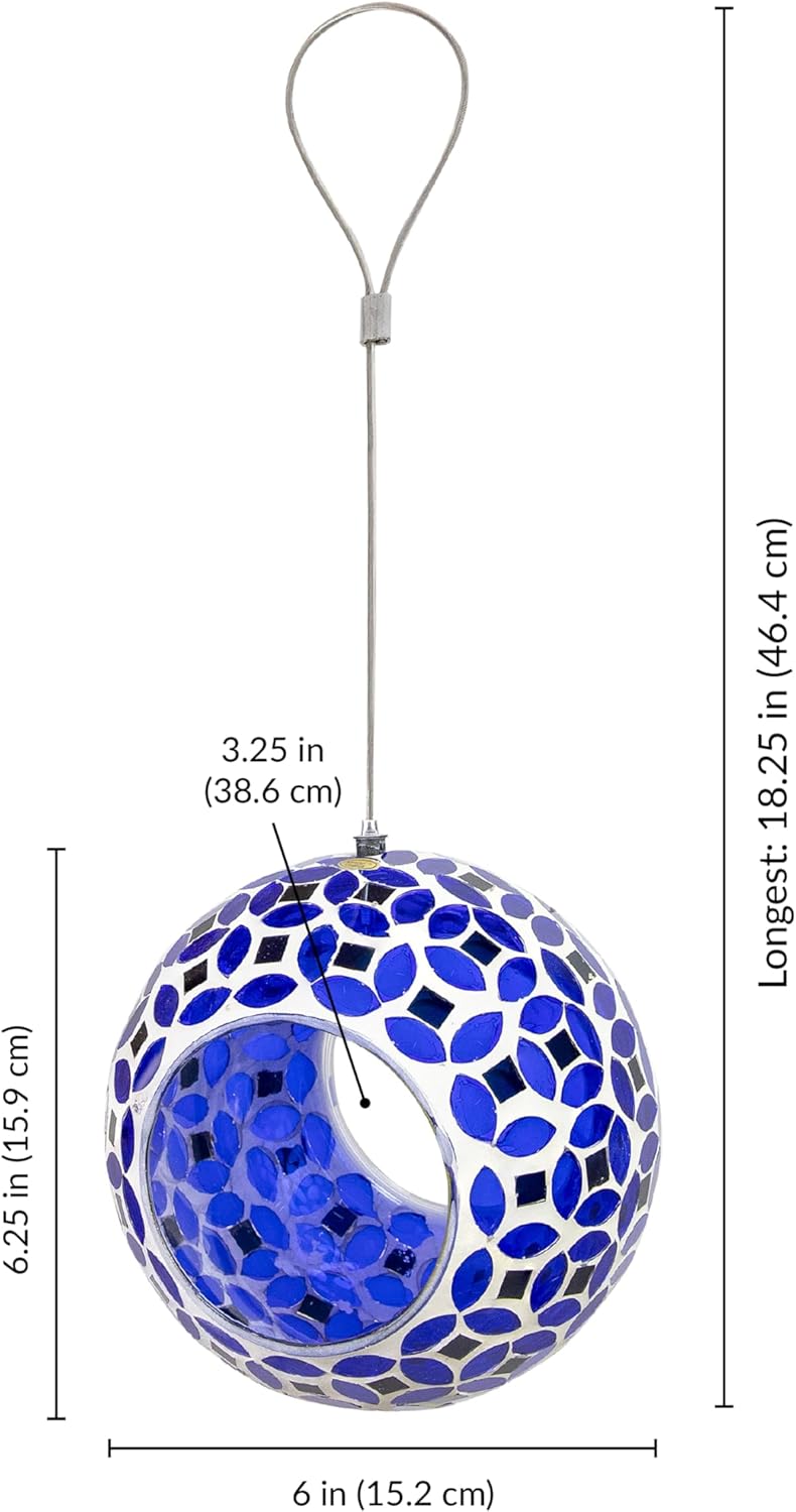 - EASY TO FILL: The 3.25" diameter opening can be accessed from two sides, making it easy to fill the glass hanging bird feeder with seeds. The small drainage hole in the bottom of the mosaic bird feeder helps to keep seed dry and prevent moisture from building up. The mesh tape placed over the hole allows moisture to drain without spilling the seeds. It holds approximately 1 cup of small birdseed blend. Please note that the amount of food may vary depending on the type of seed you use.