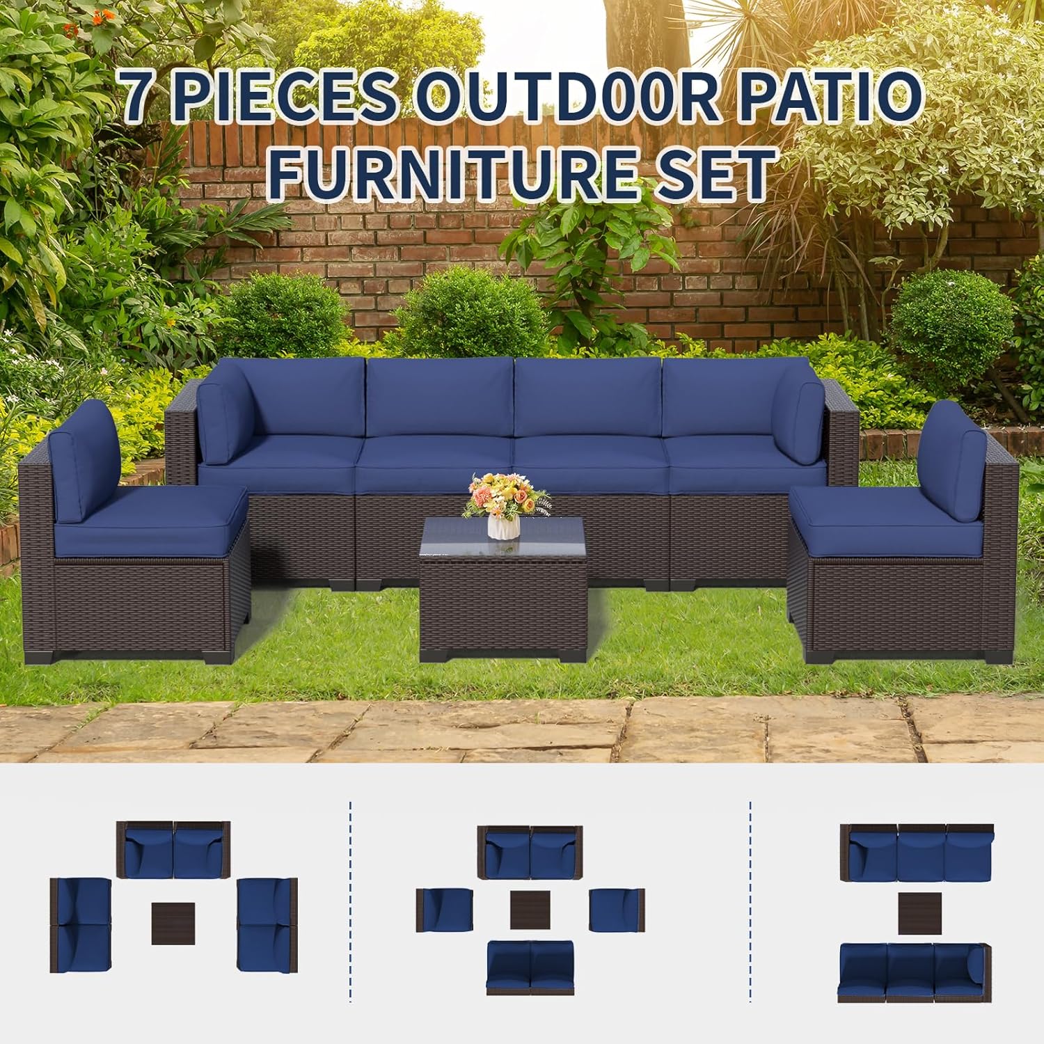 7 Piece Patio Furniture Set, Rattan Outdoor Patio Conversation Sets, Outdoor Sectional Furniture with Waterproof Cushion and Coffee Table, for Deck, Backyard, Garden