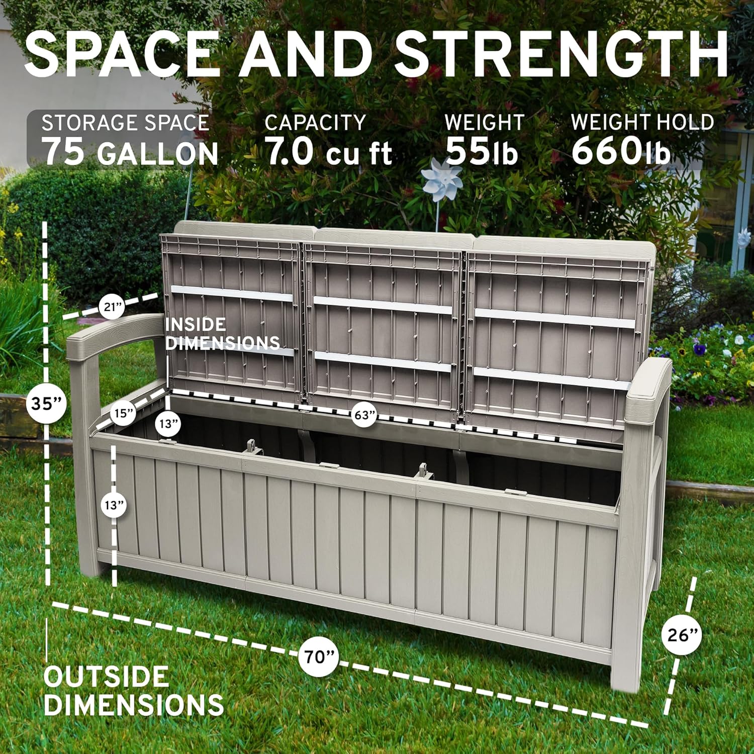 - Clear Your Yard - Bring out the beauty of your lawn by storing toys and tools out of sight. This outdoor bench has a max hold limit of 660lb and its compartment offers a lot of room at 7 cu ft.