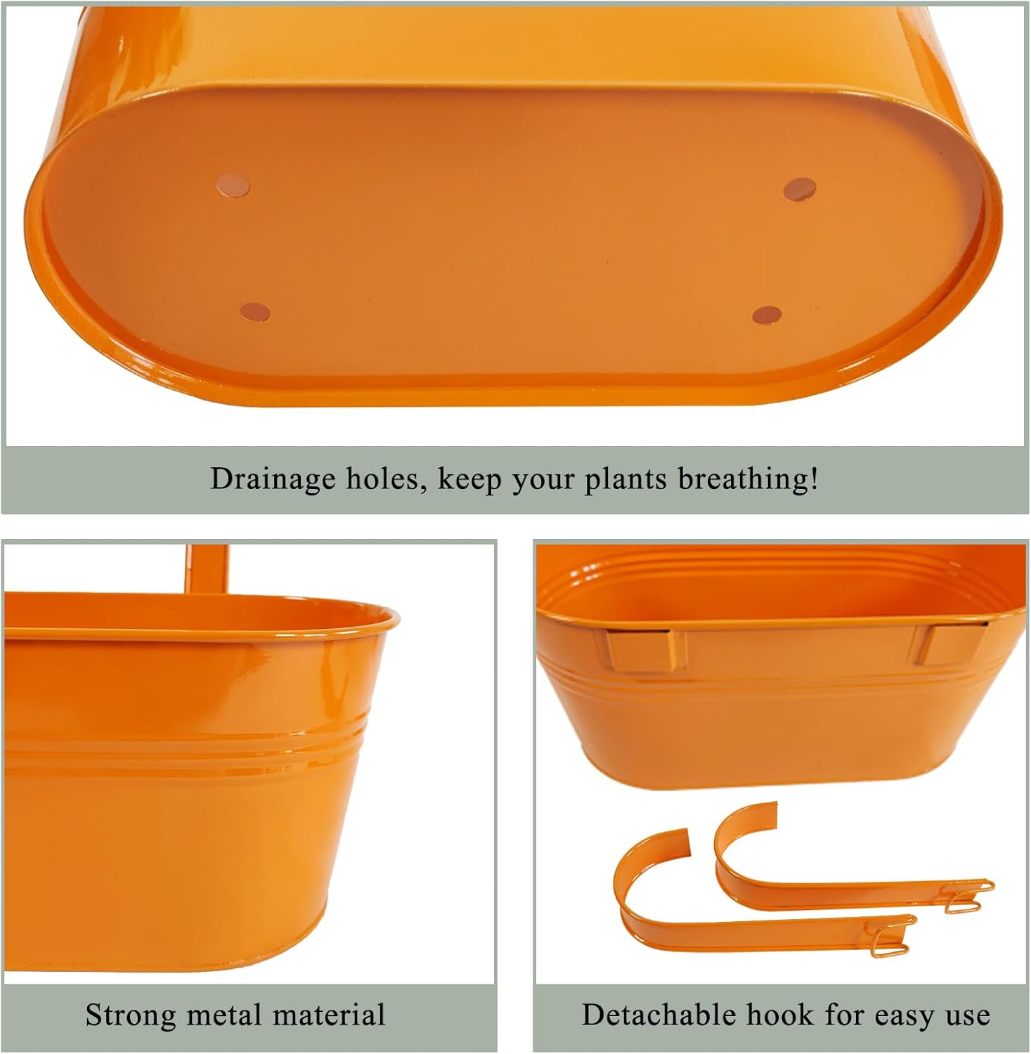 - Detachable Hook & Drainage Hole: The removable hook makes it easy to hang on deck railings, fences, or windows. The drainage hole prevents overwatering, keeping plants healthy. Great for patio planters, herb gardens, or succulents—indoors or outdoors