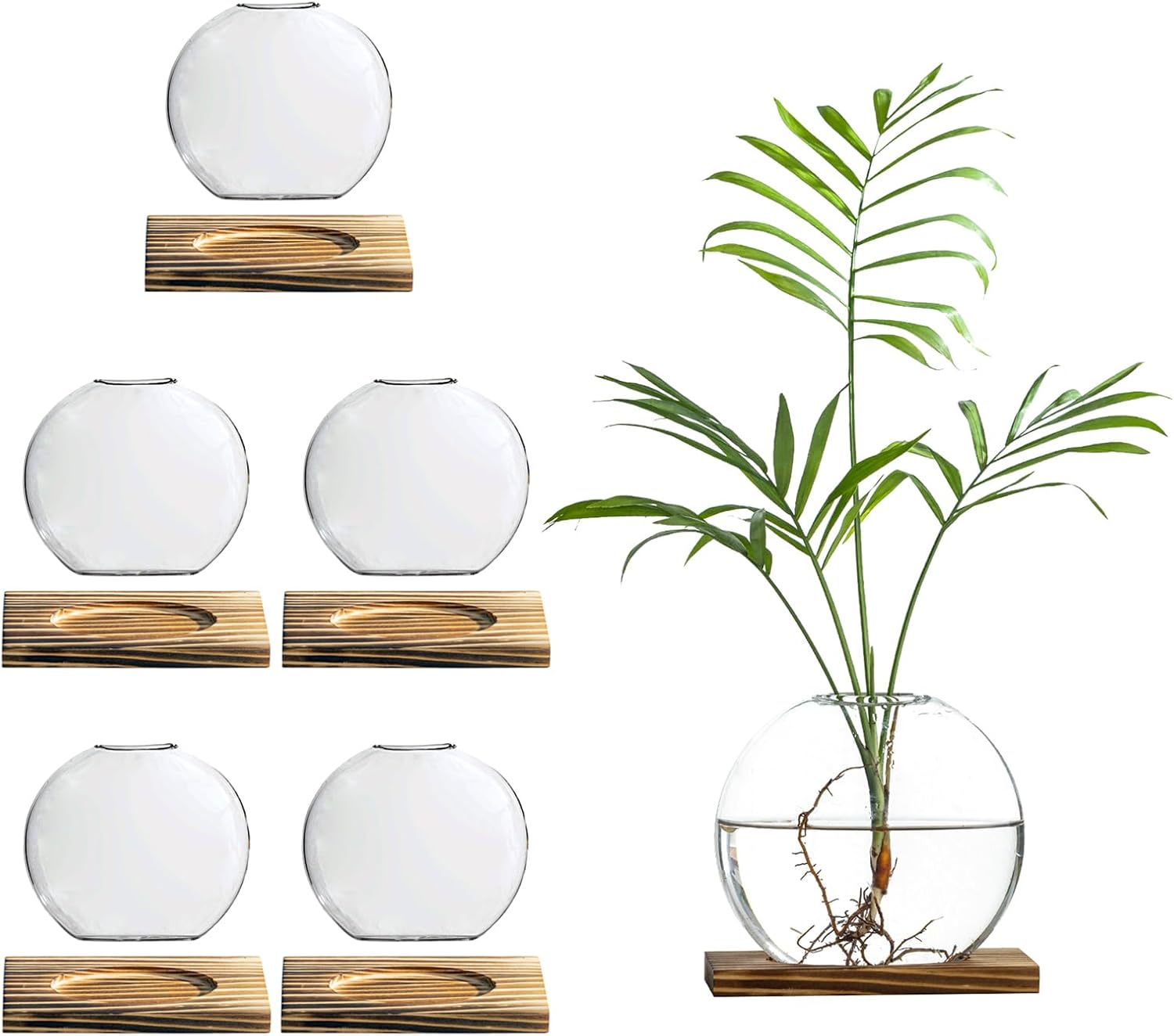 Glass Planter Propagation Station with Wooden Base - Clear Oblate Hydroponic Vase, Decorative Desktop Flower Vase for Home, Office, Windowsill - Gift for Plant Lovers (6)