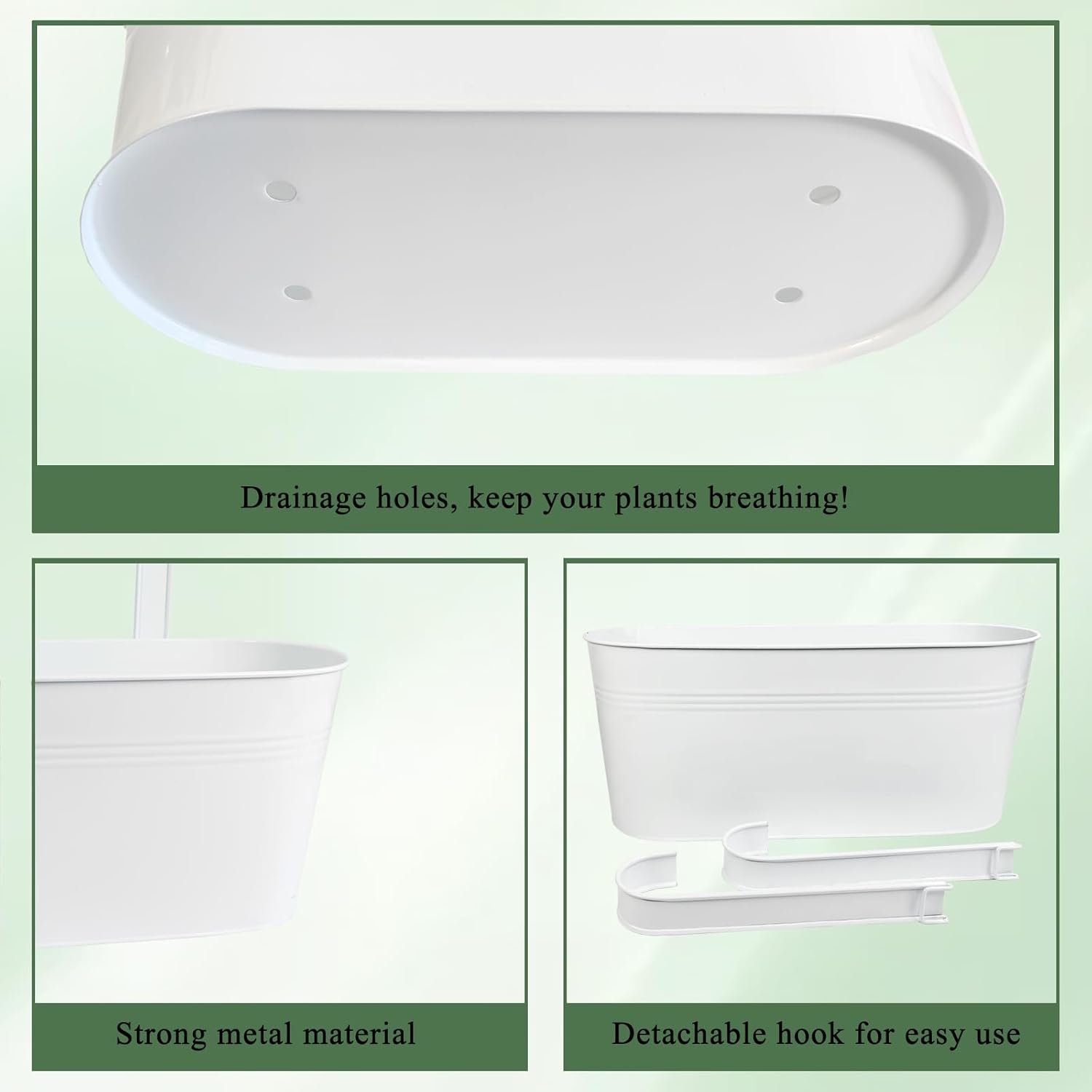 Hanging Planters for Outdoor Plants, 17" Railing Planter Pots, Metal Fence Flower Pot for Porch Balcony with Detachable Hook (White, Pack of 6)