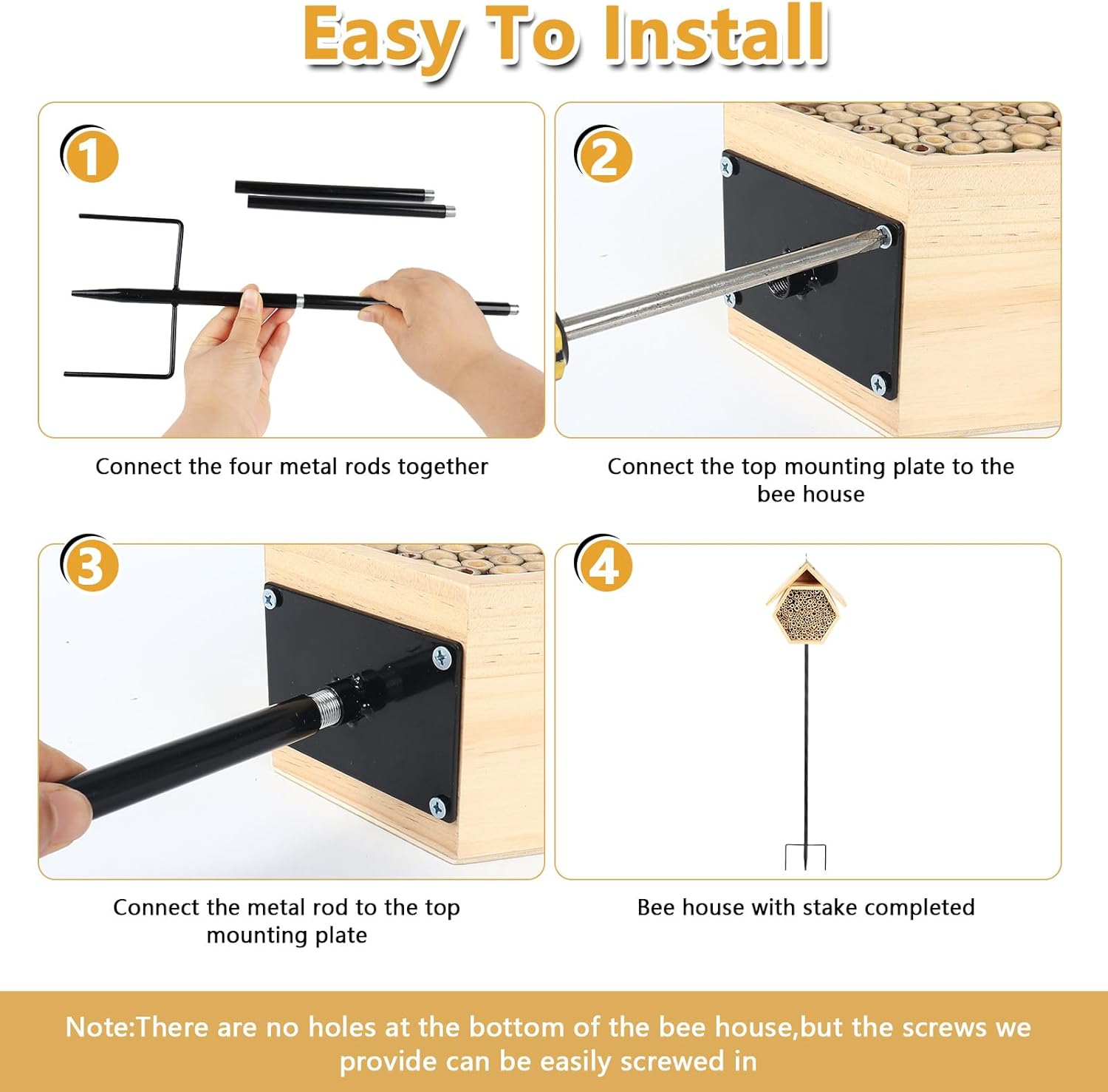 - Easy to install:package include 1pcs mason bee House with a top hook and 1pcs metal ground stake(Includes 4 screws for installation); bee house Size:8.6x8.4x3.9inch; 3installation ways: you can stand the bee house among the flowers, place it on the grass, or hang it under the trees according to the garden layout; the three-piece base can stand firmly in the soil without worrying about being affected by bad weather