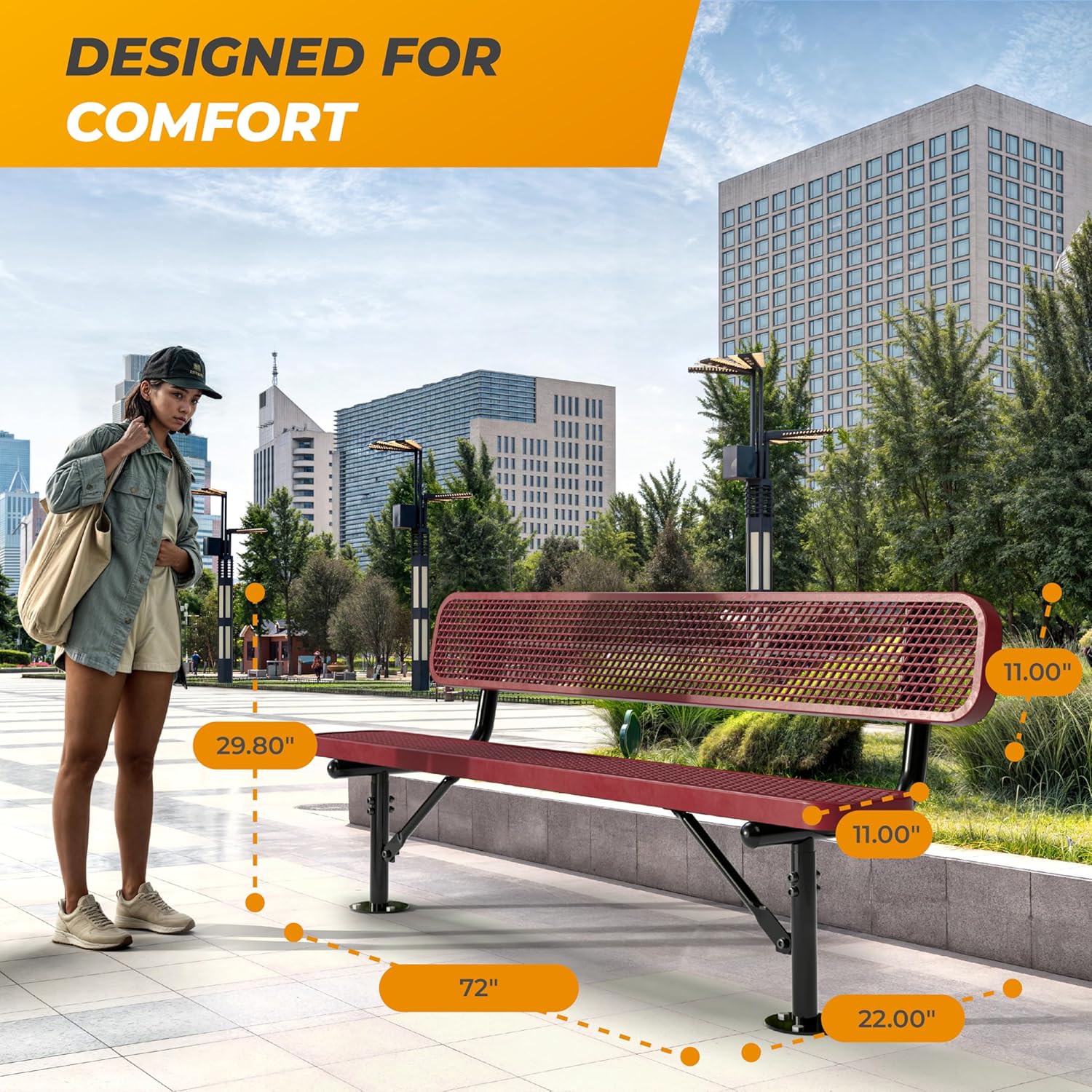 Heavy-Duty Outdoor Metal Bench, Thermoplastic-Coated, Surface, Weatherproof, Commercial-Grade for Parks, Gardens, Patios, Stores & More (6 Ft - Surface with Back, Red)