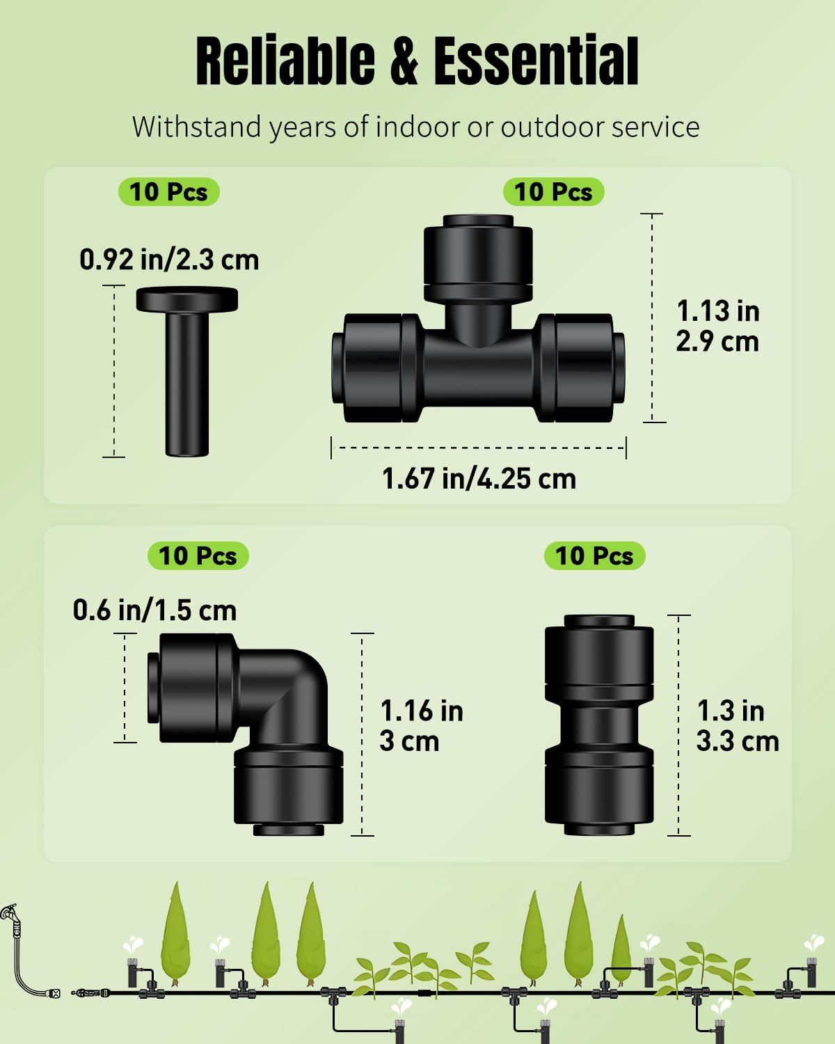 - Drip Irrigation Fittings Kit: Include forty 1/4-inch drip irrigation tubing fittings β 10 tee connectors, 10 straight couplings, 10 elbow connectors, and 10 end plugs. Made of weather-resistant plastic, they withstand years of indoor or outdoor service