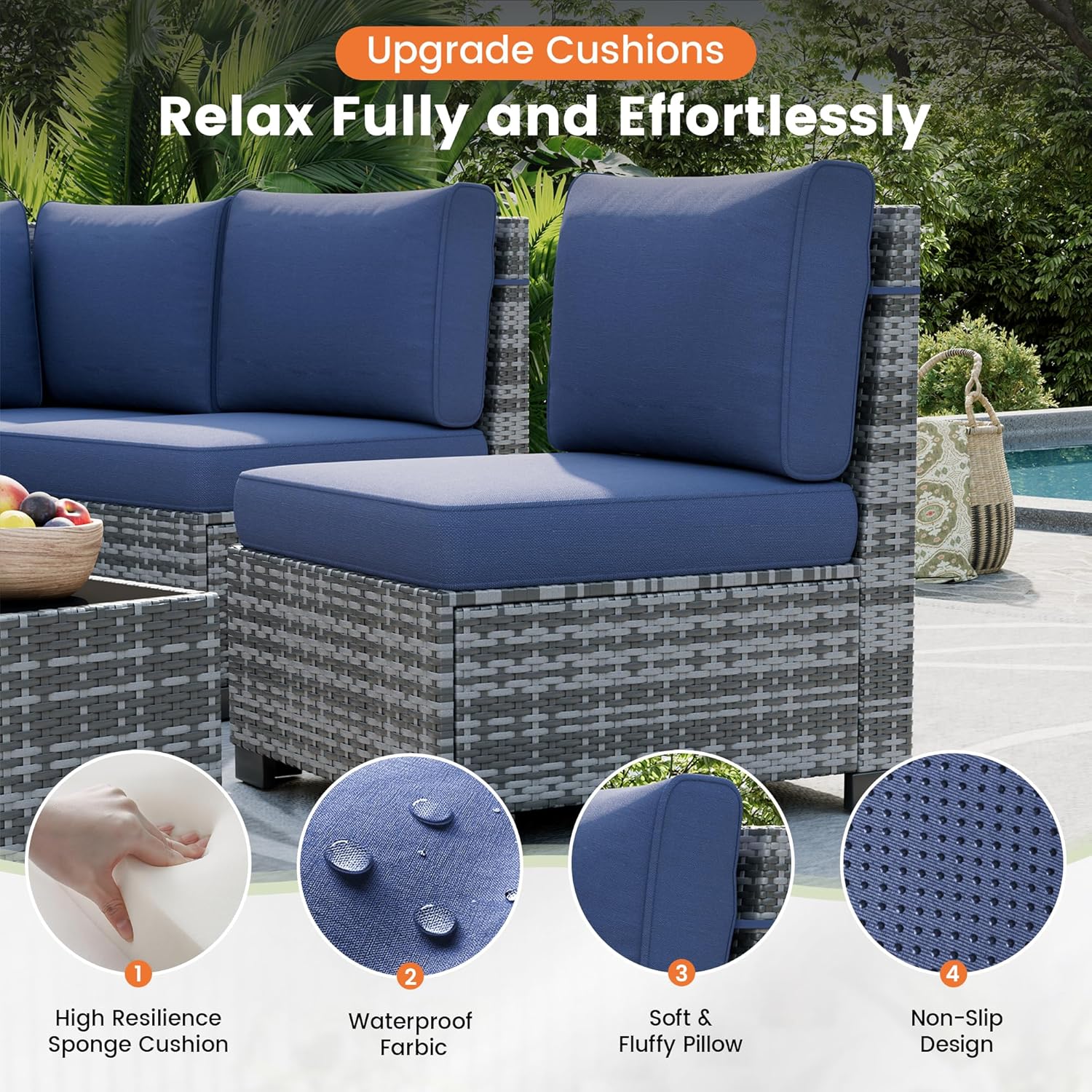 - Extra-Wide Armrests: Outdoor sectional patio set features 8-inch wide armrests that can double as convenient side tables for added functionality. Despite the wide armrests, the spacious 646 sq. ft. seating area remains unaffected. Each modular sofa includes a 105° reclining backrest, offering ultimate comfort for your relaxation.