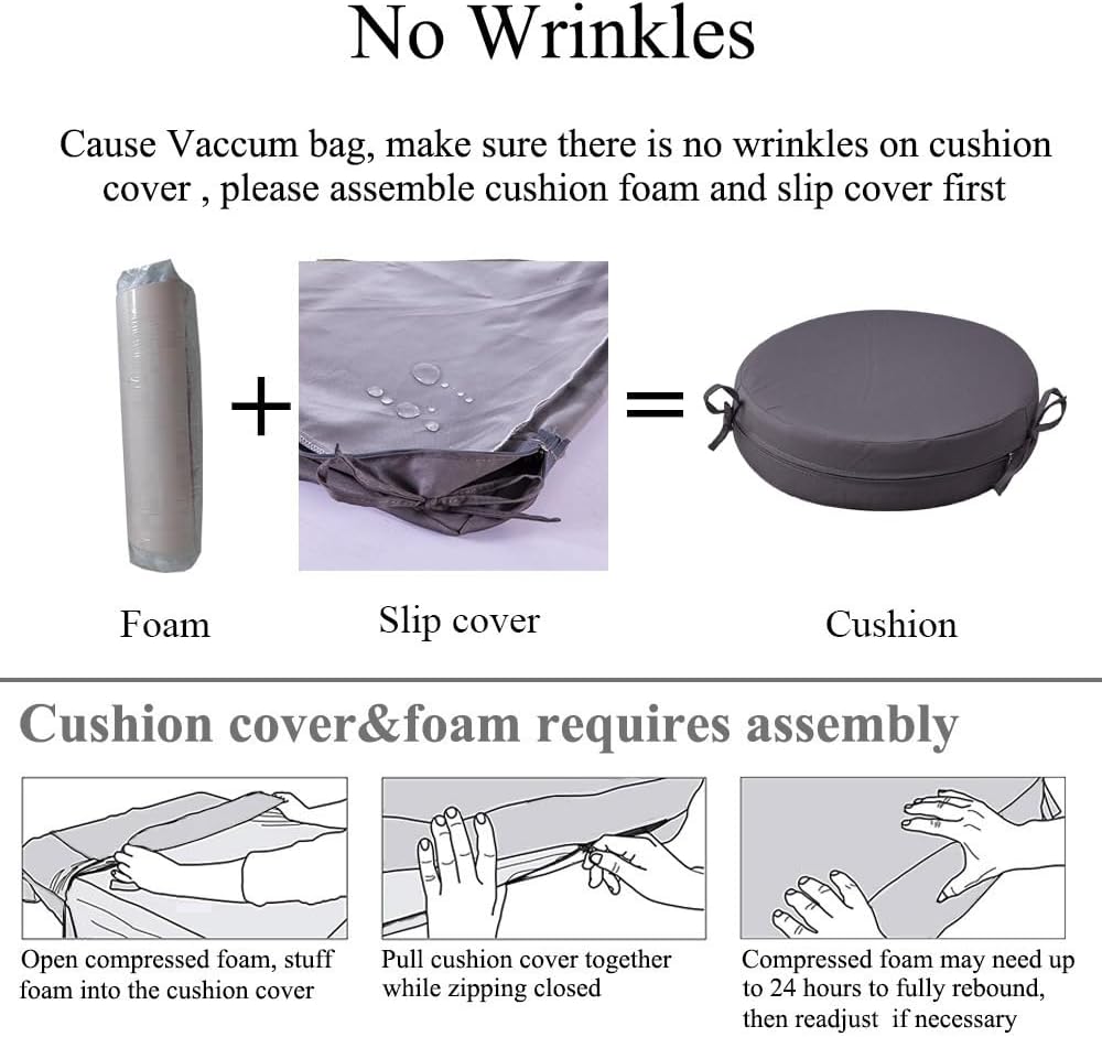 - 【Comfort & Support】 Experience ultimate comfort with the high density foam of these patio chair cushions set of 2. They provide excellent support for your hip, promoting good posture and allowing you to relax for extended periods of time. All outdoor dining chair cushions are packed with vacuum bag. You need to assemble cushion to make there is no wrinkles in cushion covers