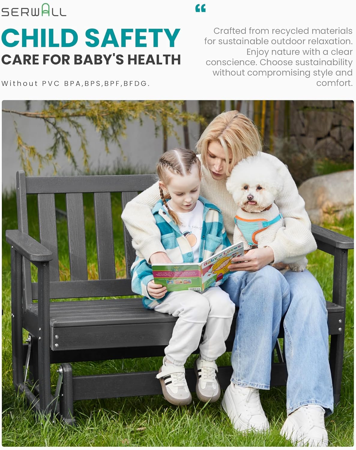 - [Outdoor Comfort] SERWALL outdoor swing chairs feature a unique wood-like texture, adding a touch of natural beauty to your space. Enjoy the fresh air and sunshine in comfort with this outdoor glider bench, create your outdoor relaxation paradise.