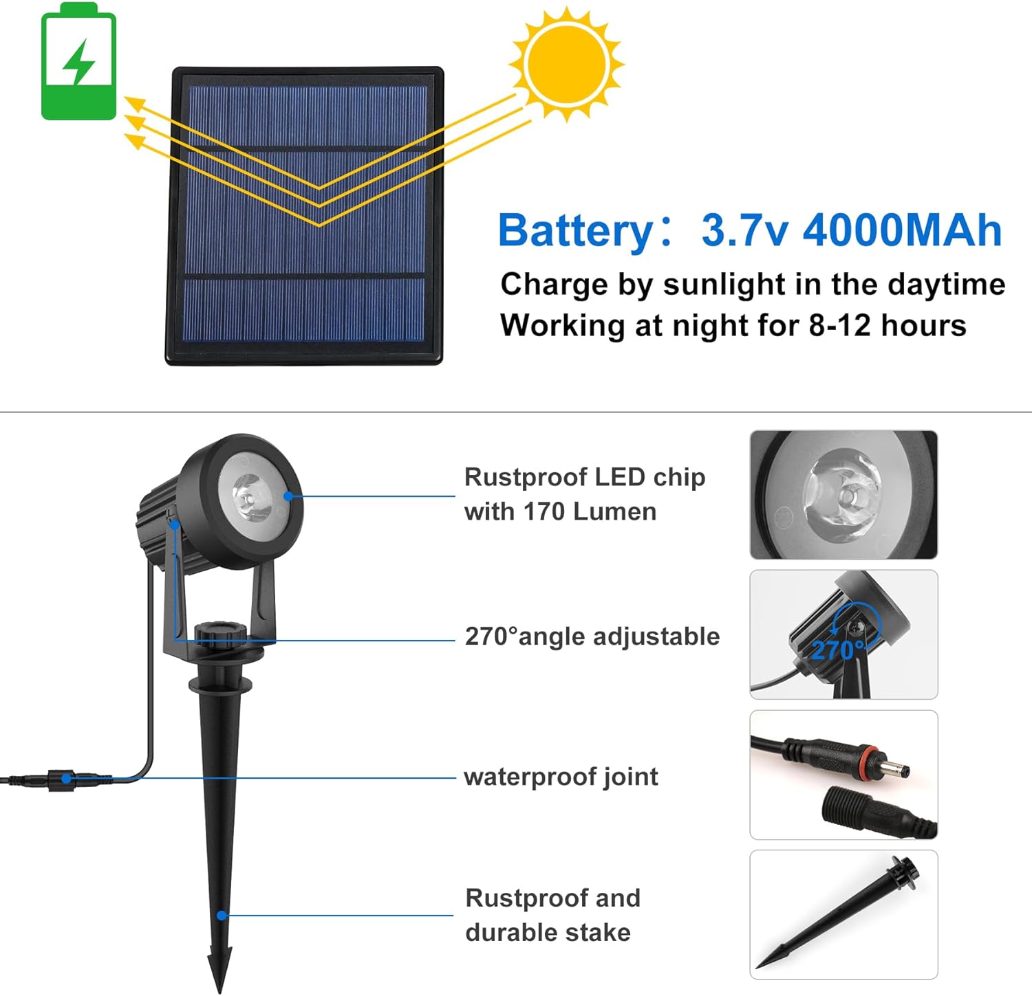 - Waterproof IP65: Black housing ABS high quality landscape spotlight with excellent stability and durability.IP65 waterproof rating, the solar landscape lights can withstand rain, snow, snow and other bad weather